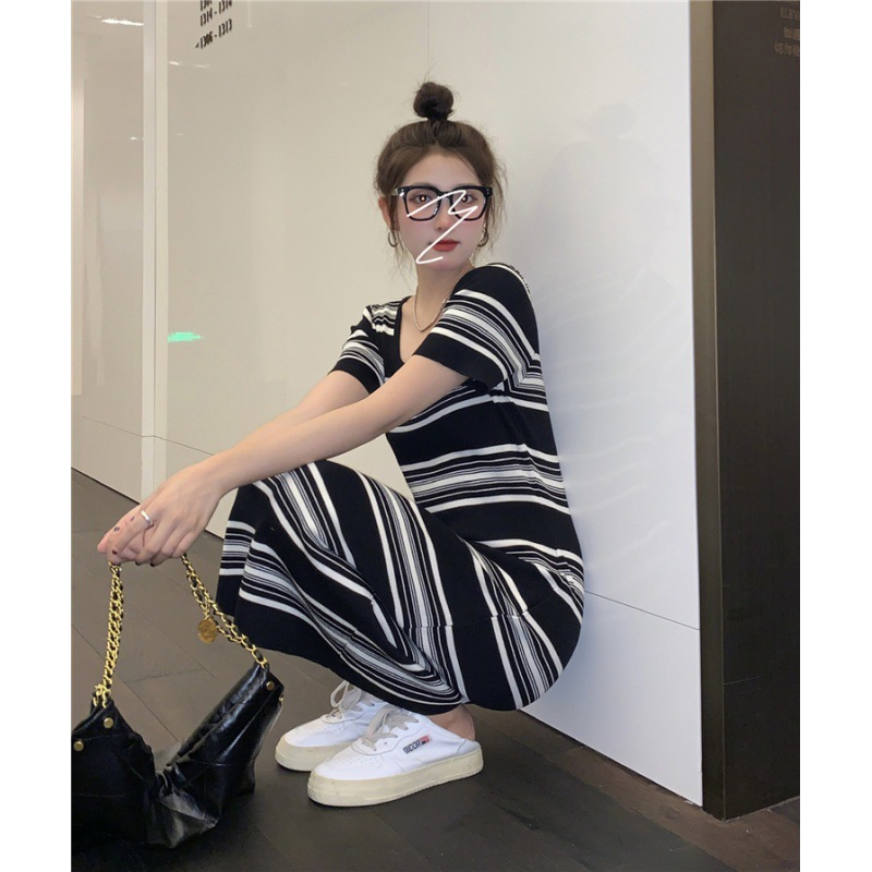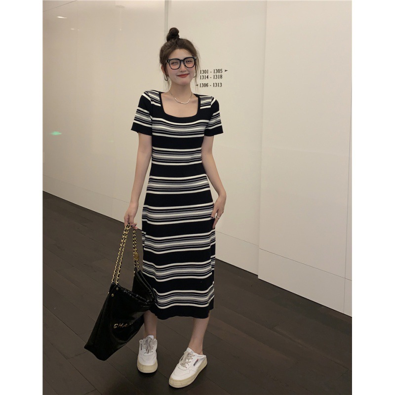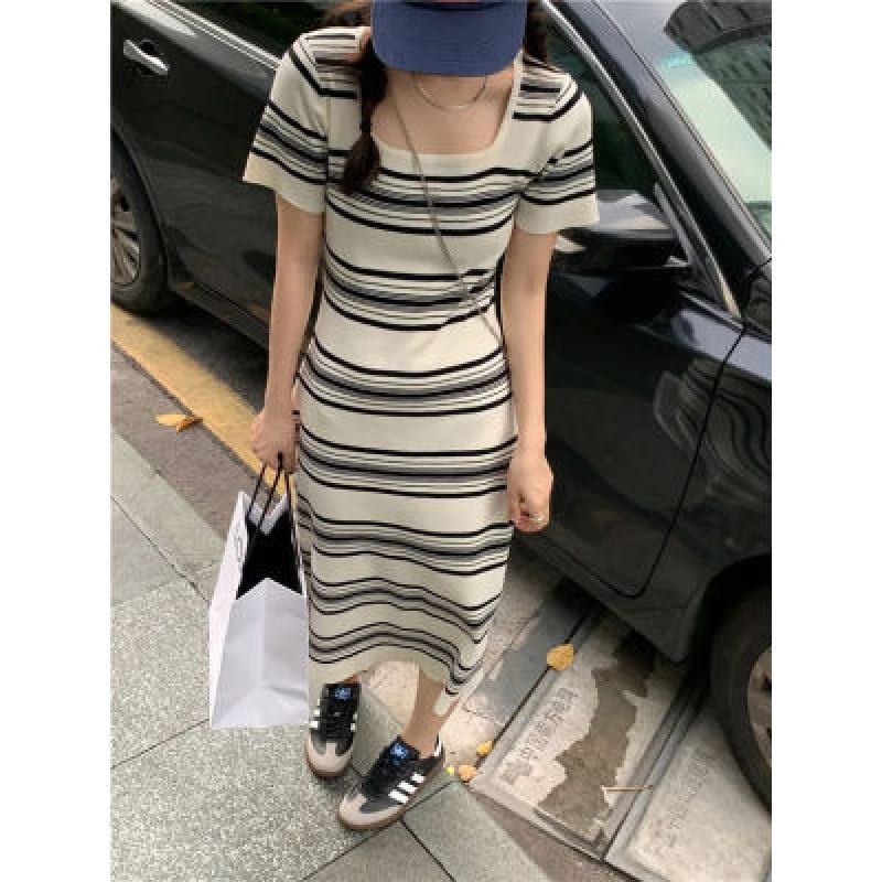 撞色条纹短袖针织女2025新款韩系独特漂亮初春裙子女夏连衣裙长裙