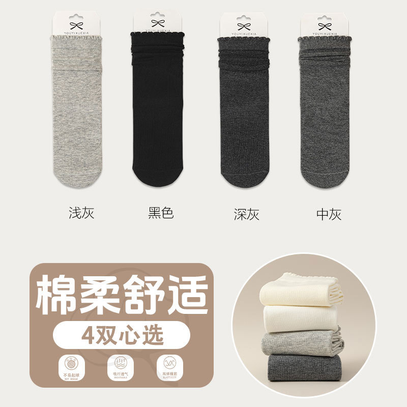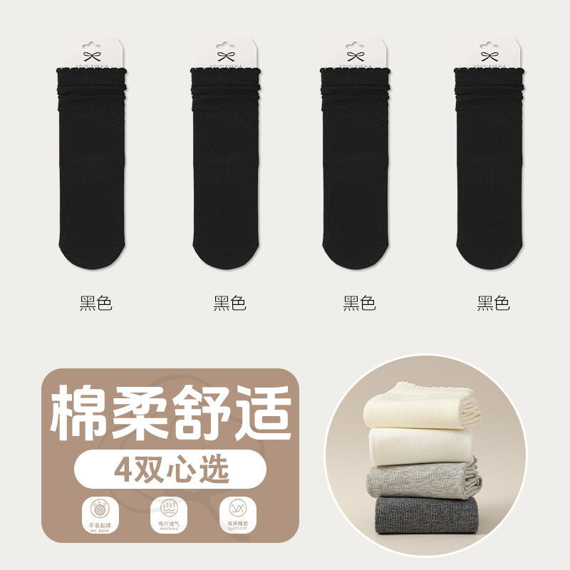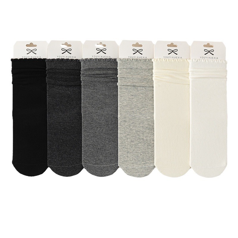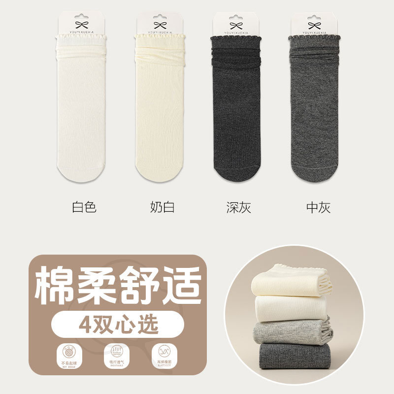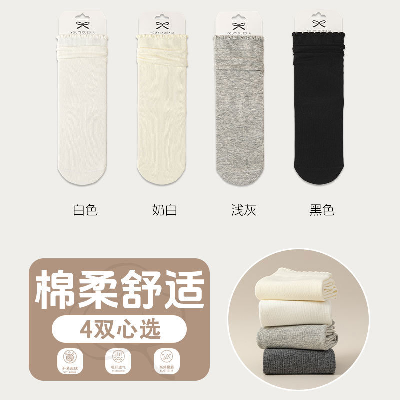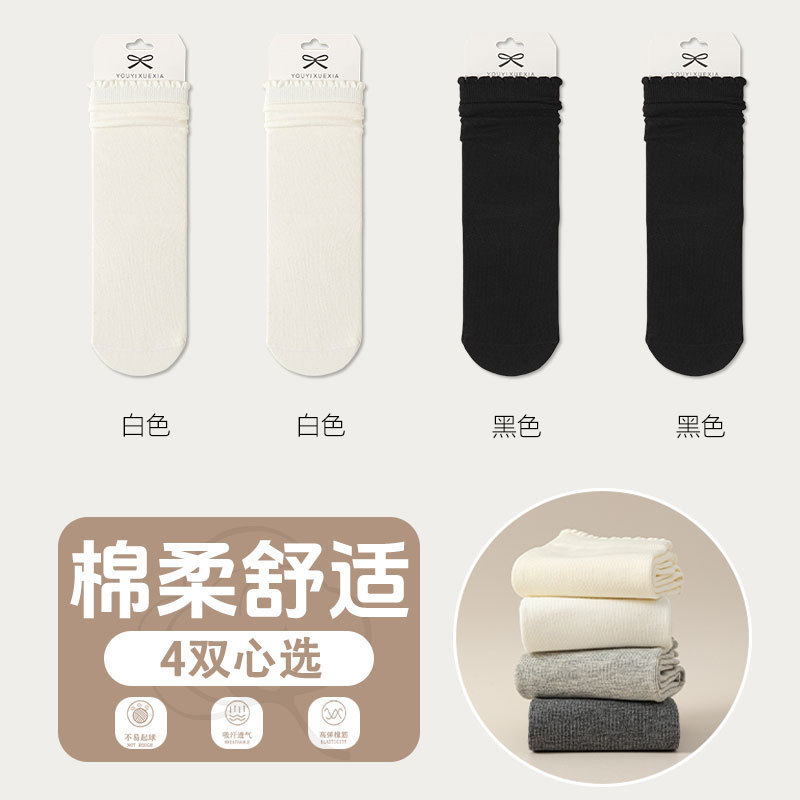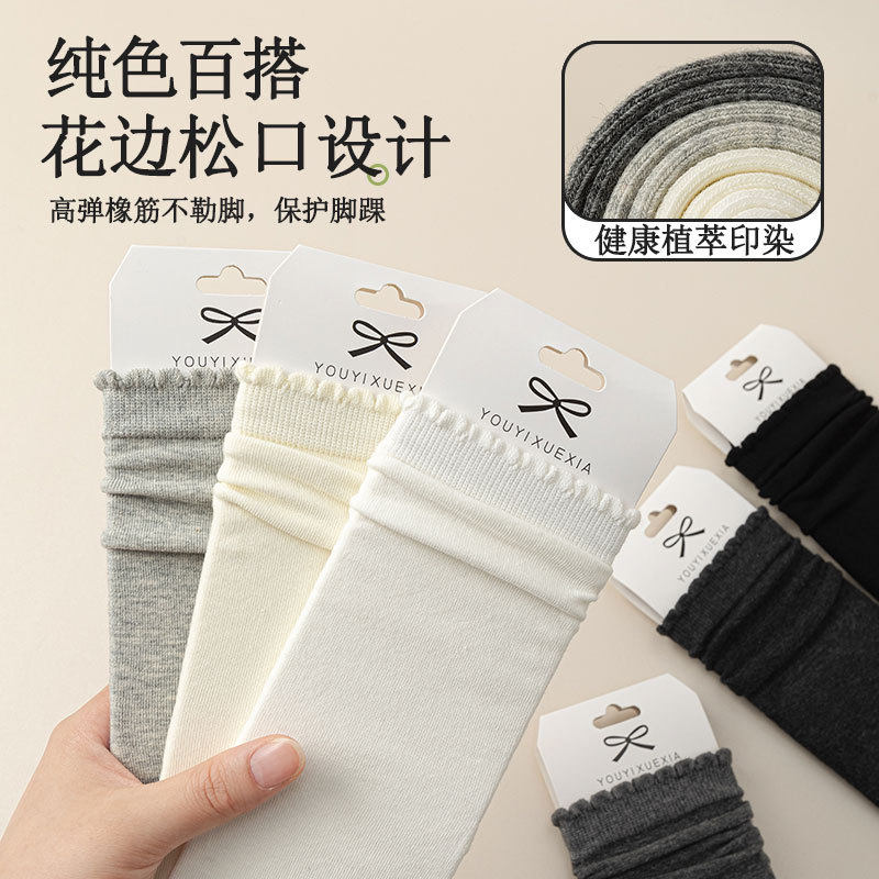 堆堆袜子女士春秋中筒袜日系少女无骨学院风木耳花边运动纯色棉袜