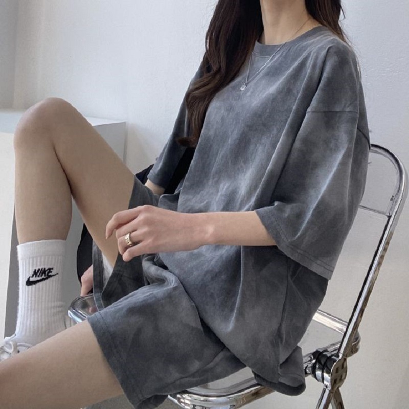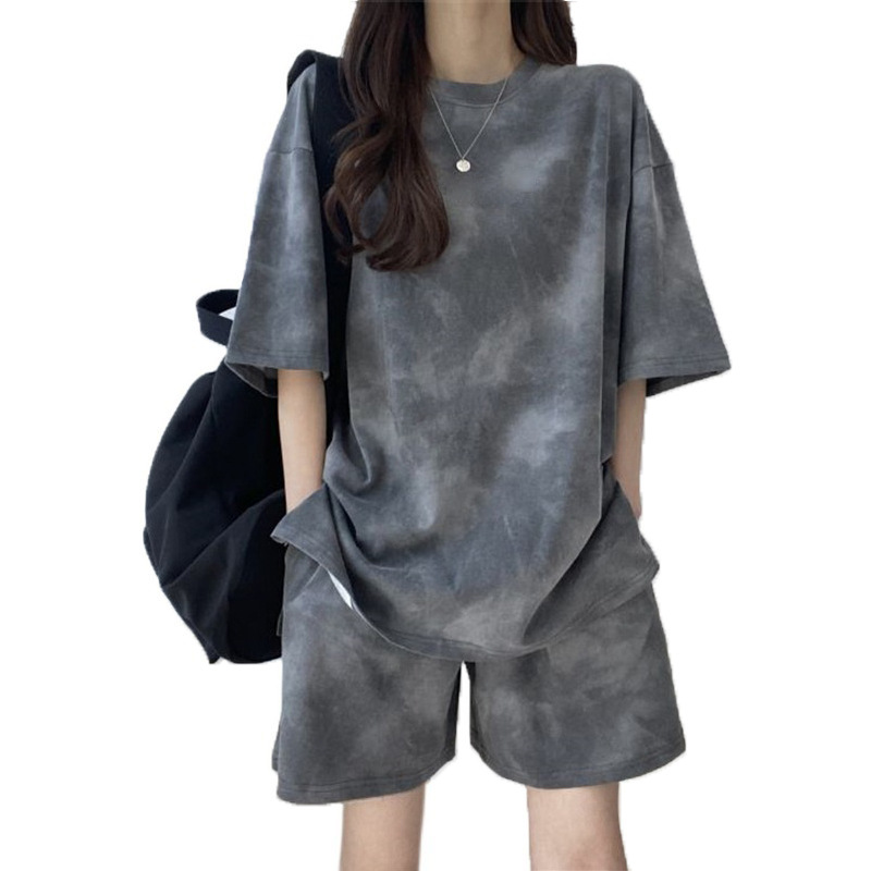 扎染运动装小个子两件套女夏休闲短袖T恤打底衫宽松阔腿短裤套装