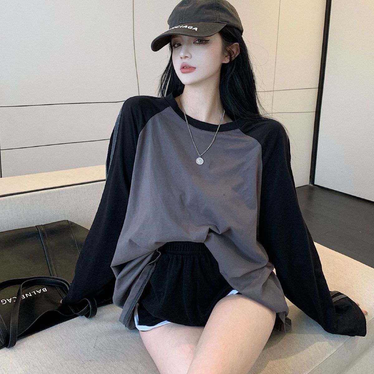 纯棉美式复古高街甜辣慵懒上衣春秋圆领撞色时尚长袖t恤女学生潮
