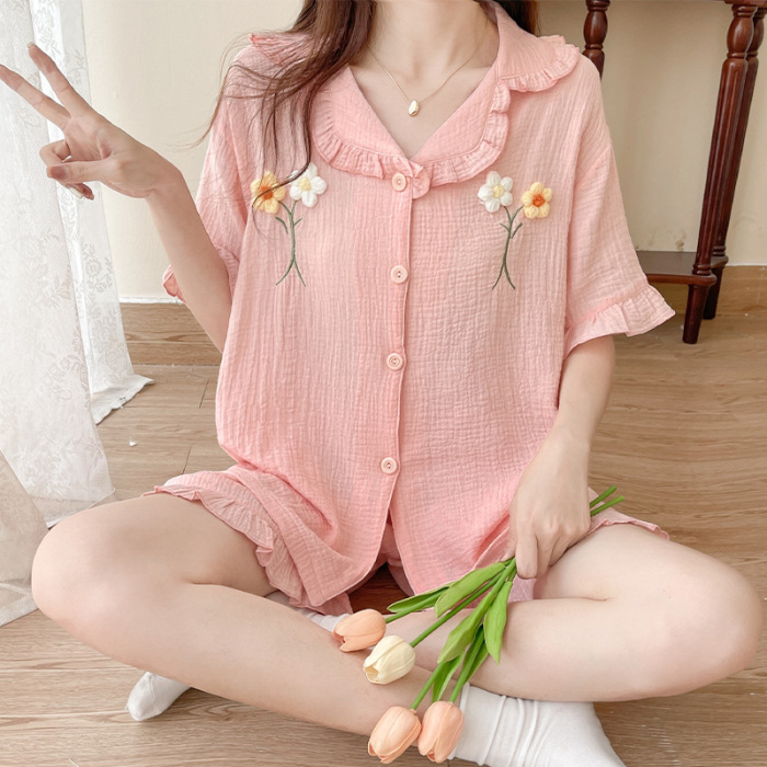 夏季睡衣小甜美立体花朵棉纱开衫短袖短裤家居服女士全棉套装大码