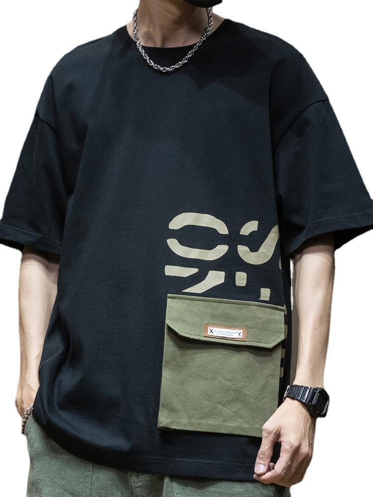 新款短袖t恤男装宽松衣服夏季大码胖子男士潮牌口袋印花上衣
