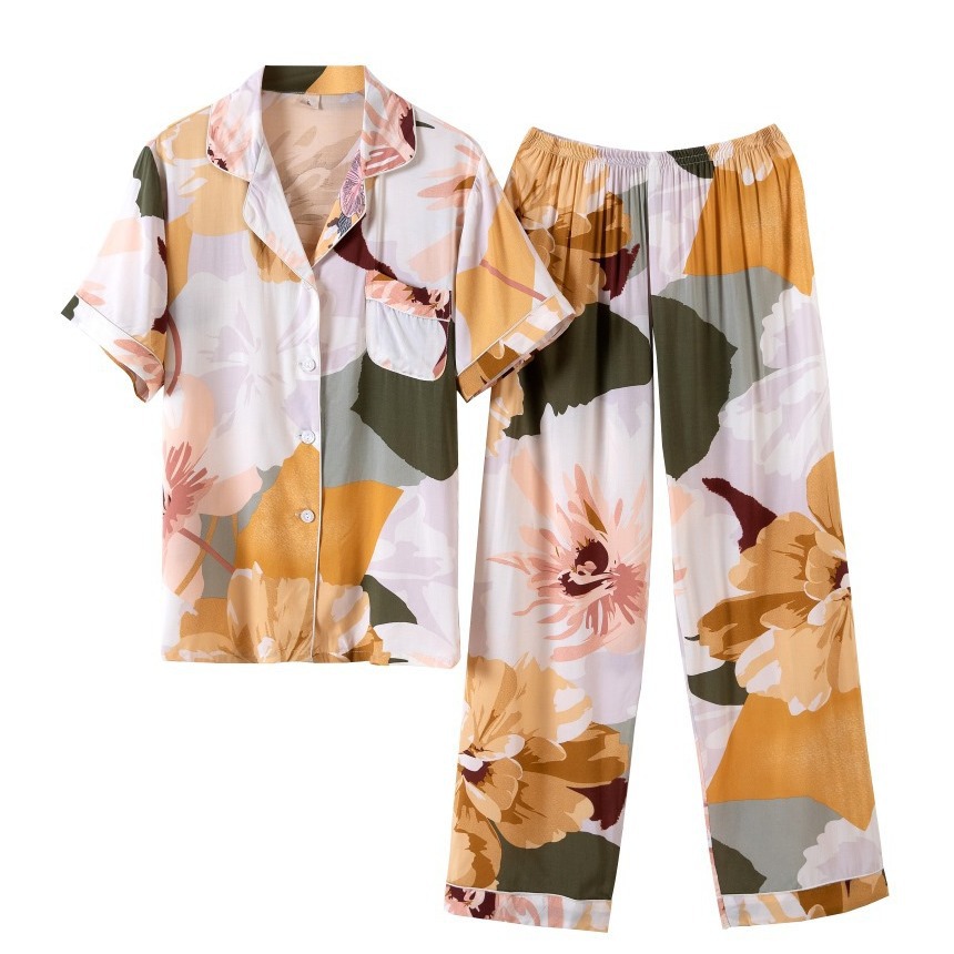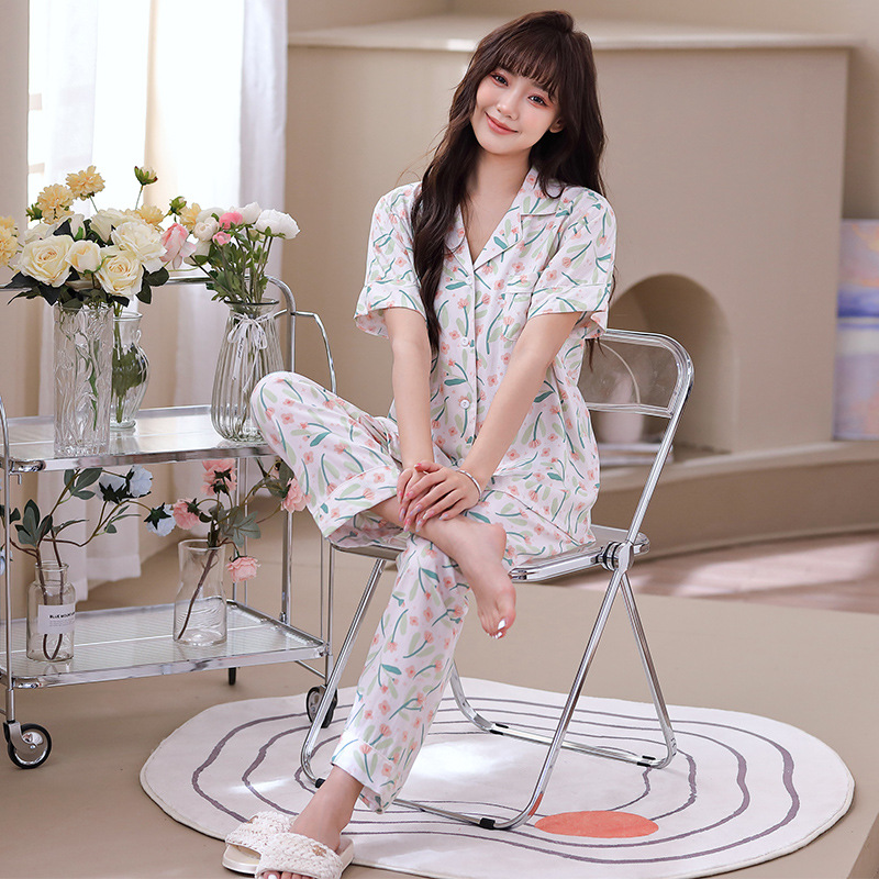 春夏季薄款睡衣女士短袖长裤套装人棉绸领韩版翻领钮扣开衫睡衣