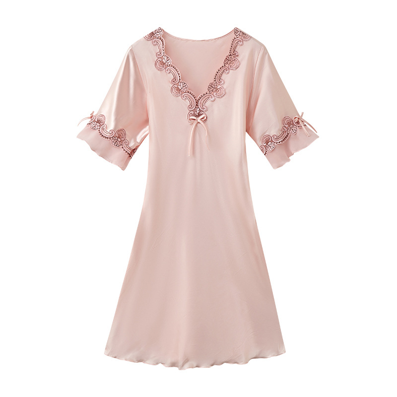 夏季薄款女士冰丝睡裙绸缎性感蕾丝花春夏款中袖连衣裙家居服