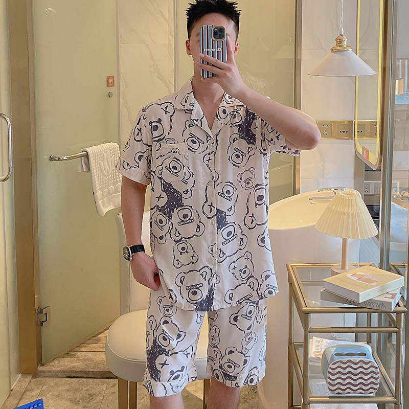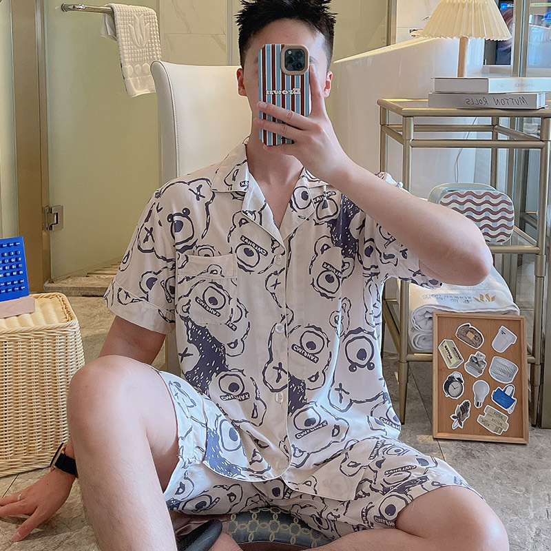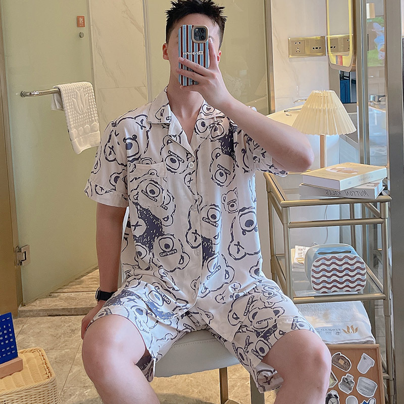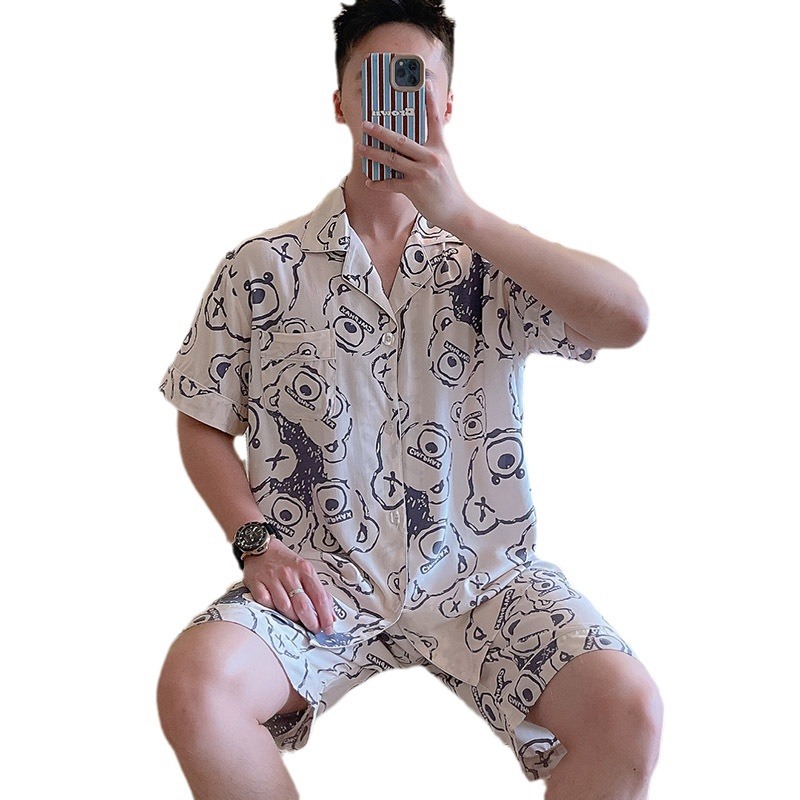 男士睡衣夏季棉绸短袖新款开衫家居服夏天薄款加大码
