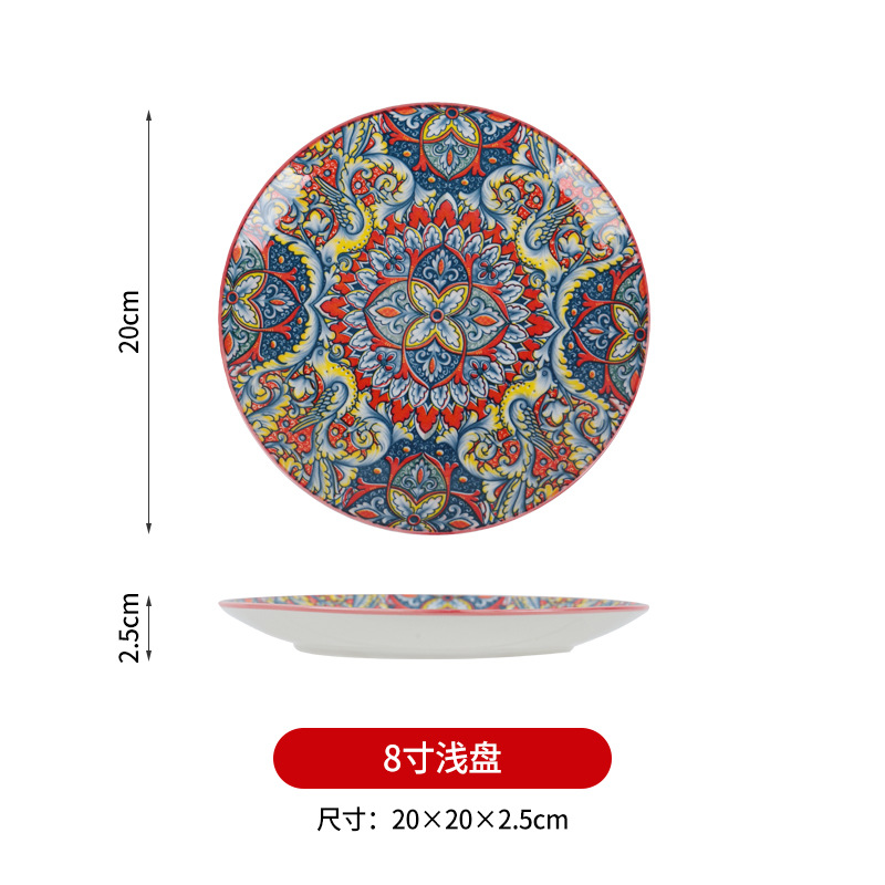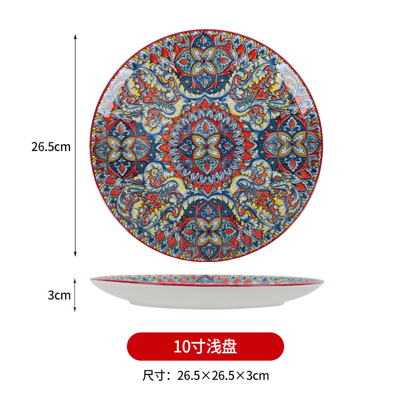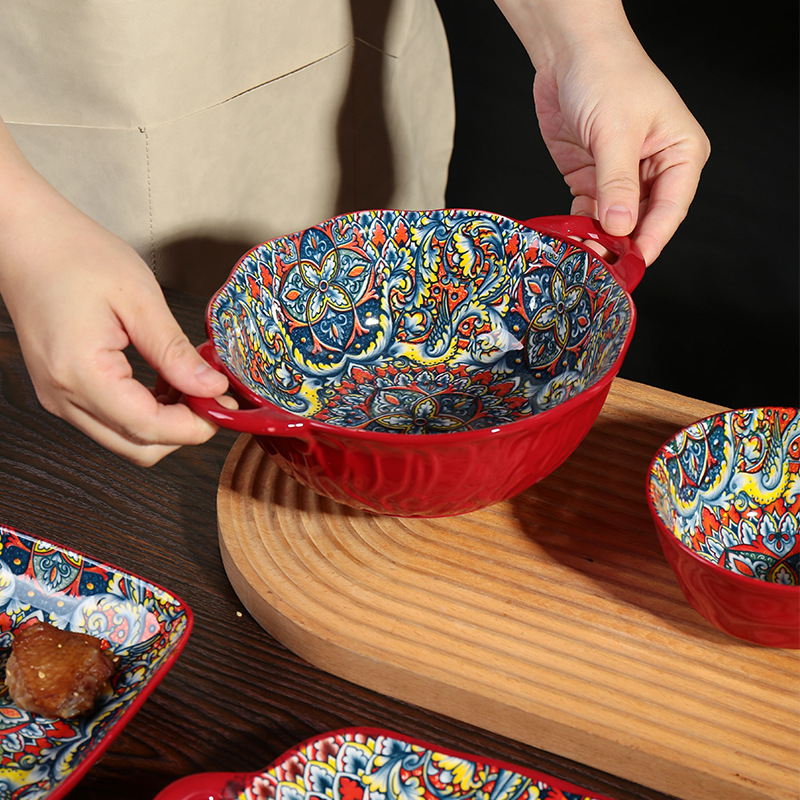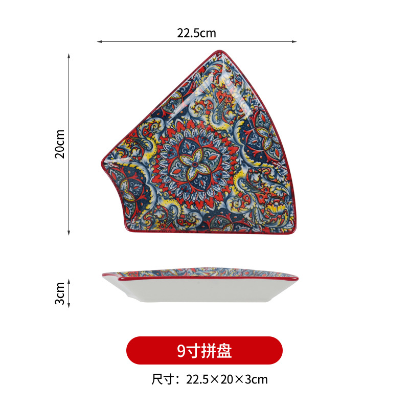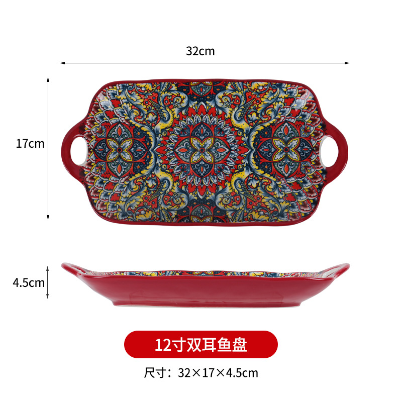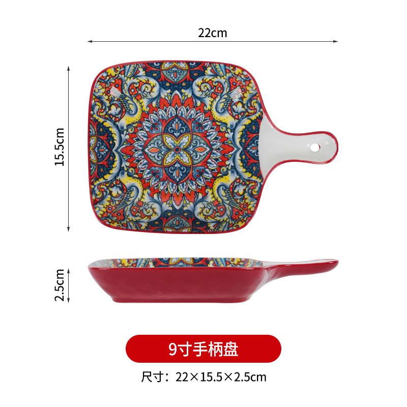波西米亚风碗碟双耳正方盘高颜值釉下彩陶瓷餐具套装碗碟盘