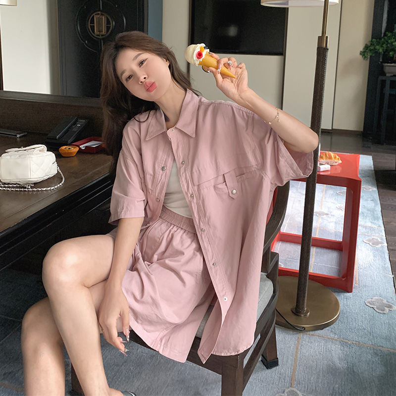 新款休闲短袖衬衫短裤两件套洗水棉宽松外套工装夏季时尚套装