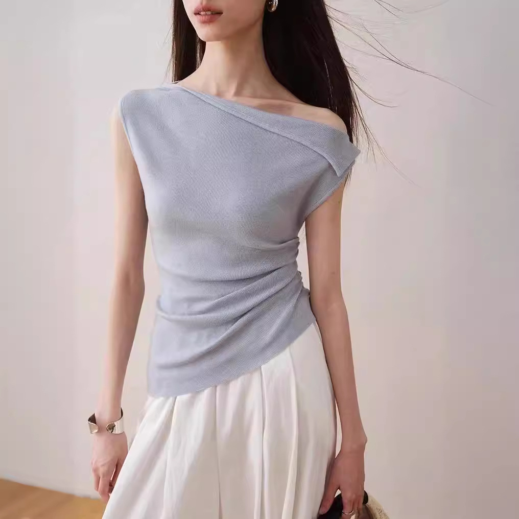 ron韩系不规则斜肩无袖T恤夏季新款小众修身显瘦纯色褶皱上T