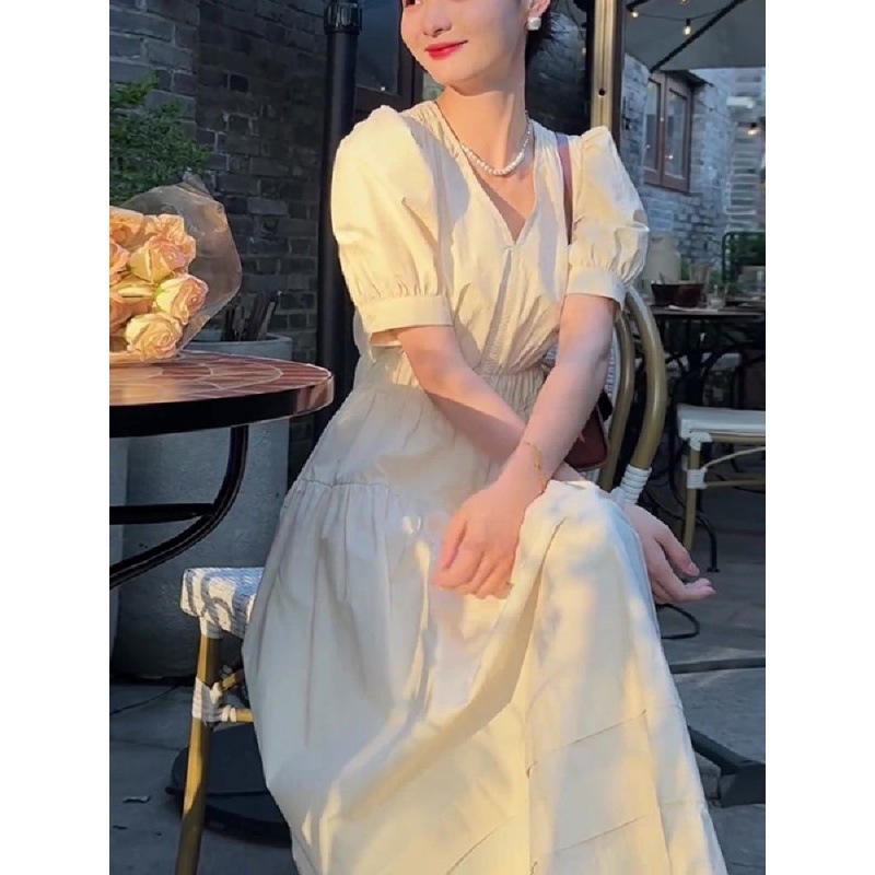 法式v领短袖连衣裙女温柔气质收腰大摆裙夏季新款女装长裙子