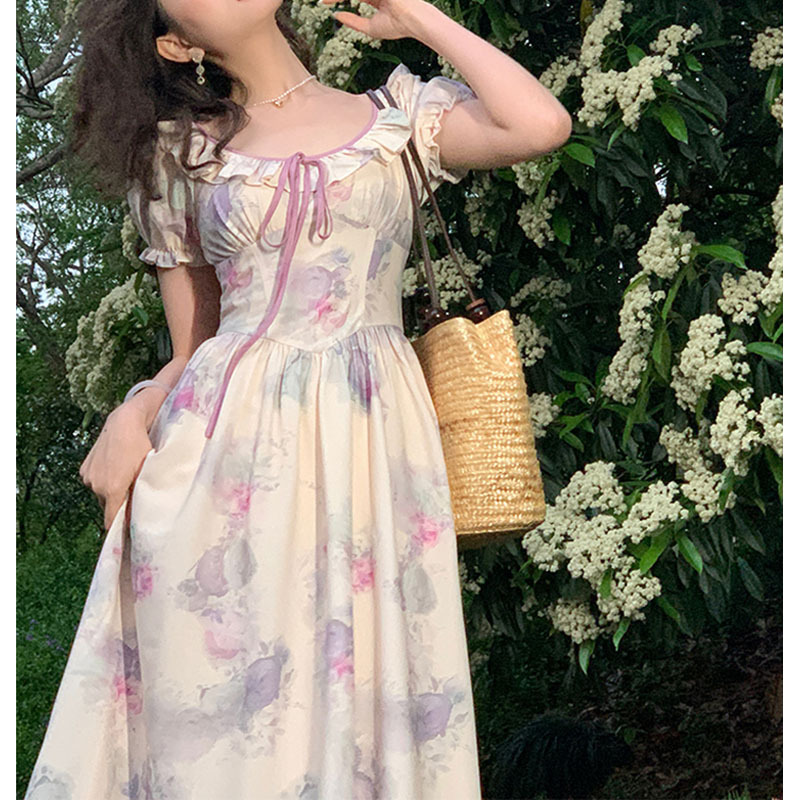 新款法式印花复古显瘦气质欲连衣裙女仙女裙夏季长裙