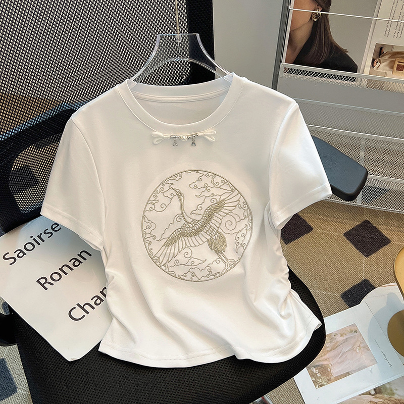 新中式盘扣刺绣国风短袖t恤女夏新款设计感小众绣花修身上衣