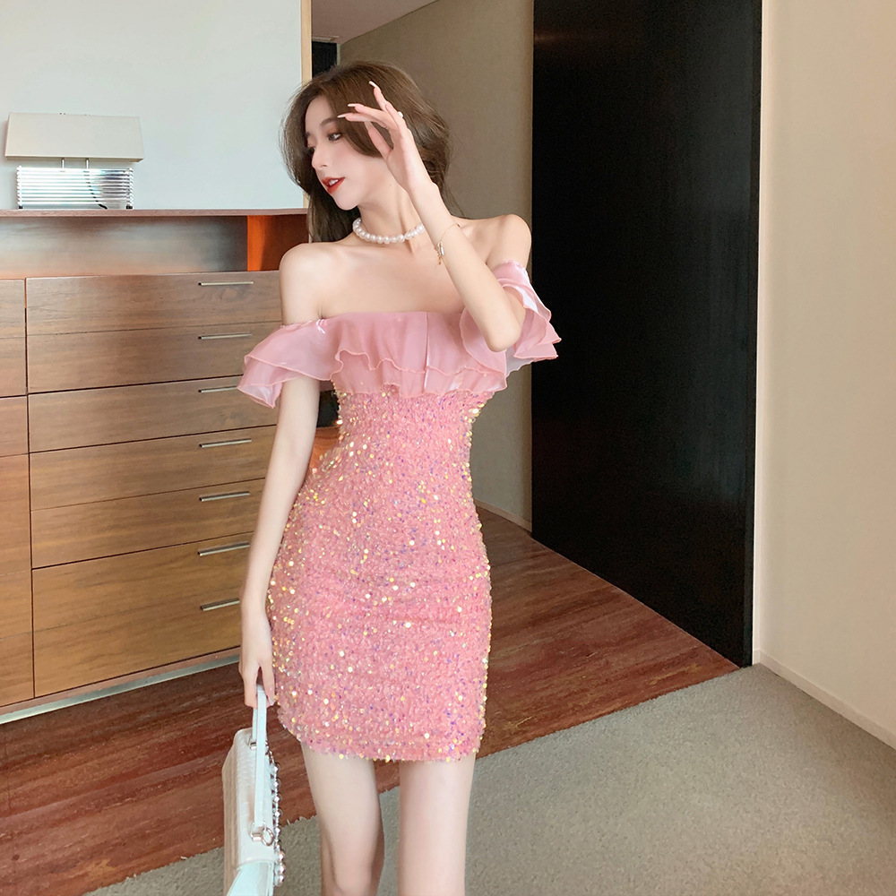 法式辣妹包臀裙女新款名媛重工艺珠片雪纺拼接修身露肩礼服连衣裙