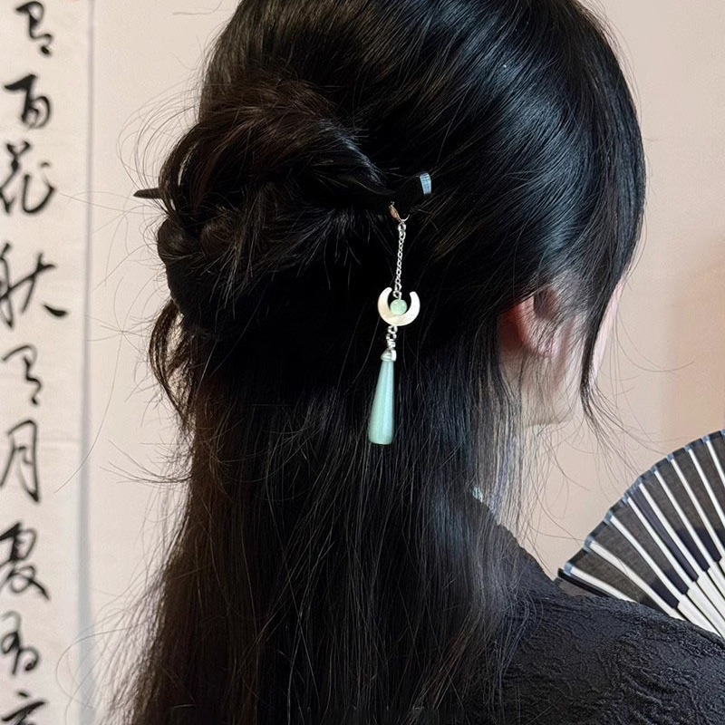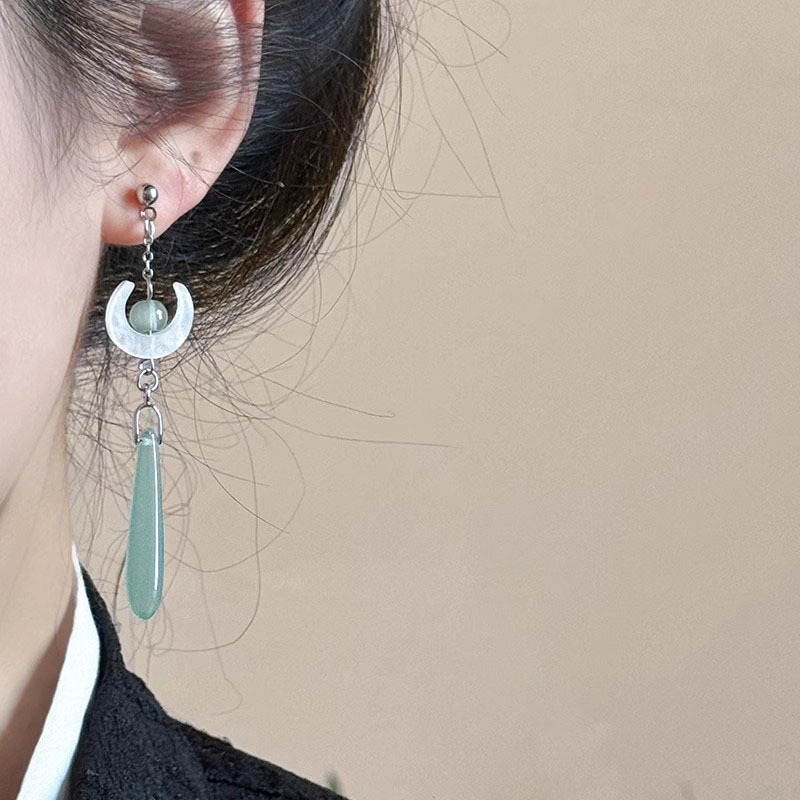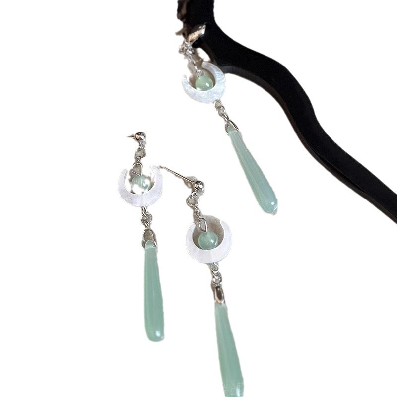 新中式浅绿色月亮水滴耳环女古风汉服配旗袍的发簪国风发饰耳饰品