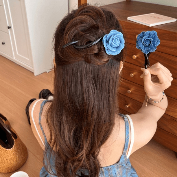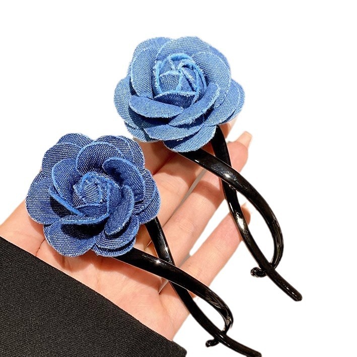 甜酷蓝色牛仔花高级感扭扭夹半扎发一字发夹女后脑勺盘发头饰发卡