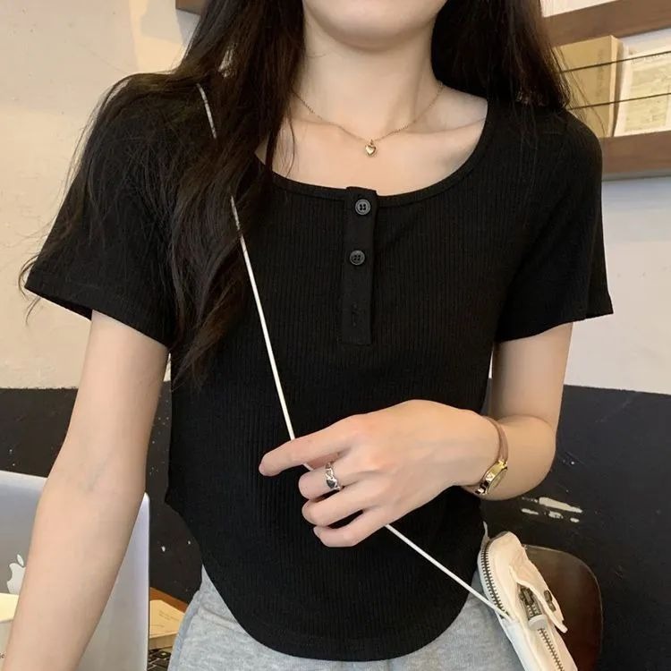夏季圆领显瘦修身百搭纯色短袖T恤女纯欲风弧形下摆上衣潮