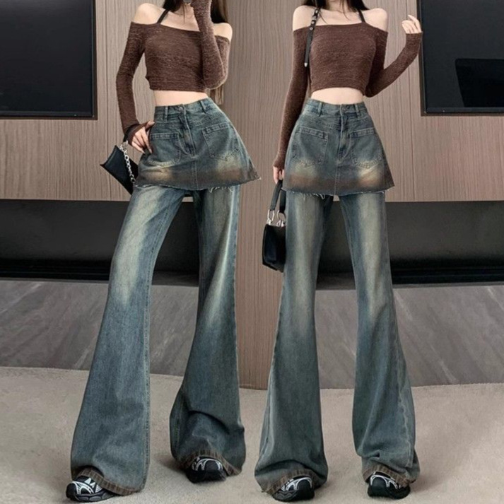 美式复古微喇牛仔裤女春秋设计感假两件高腰裤垂感百搭拖地喇叭裤