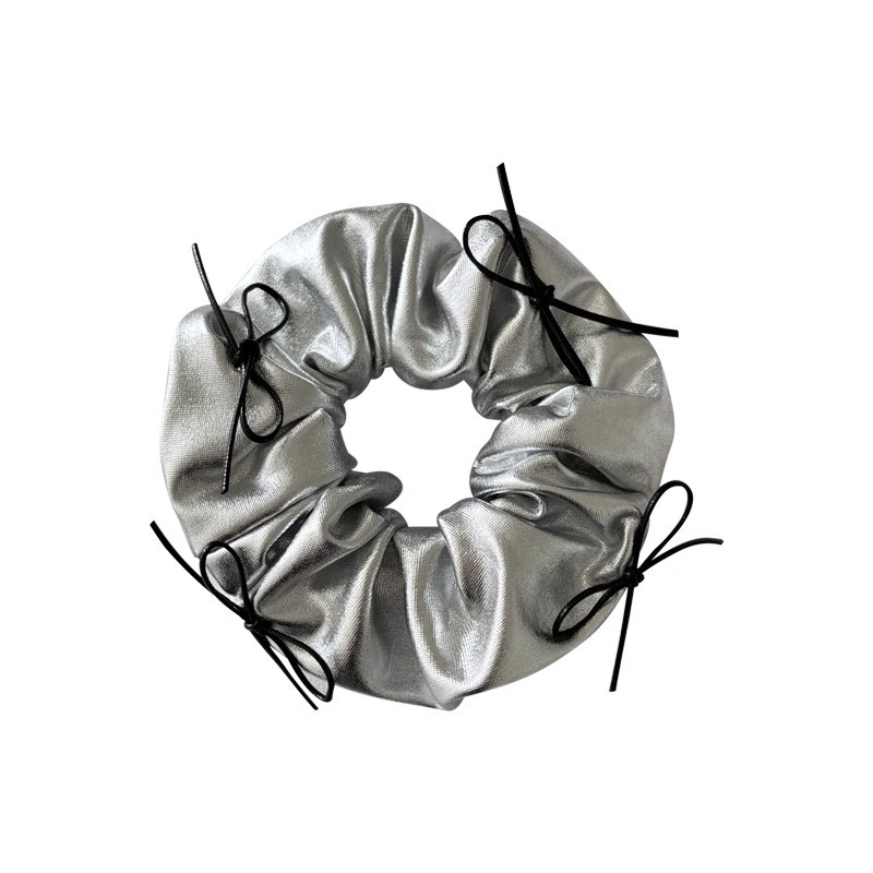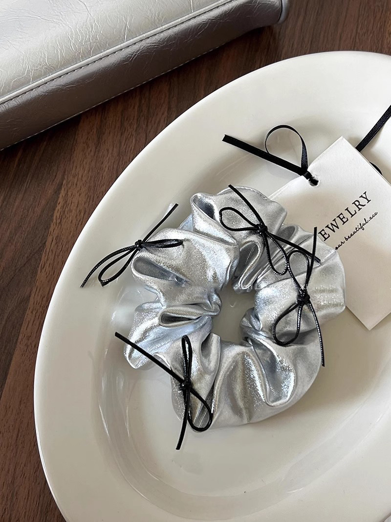 银色皮质蝴蝶结大肠发圈女新款高级感扎头发头绳皮筋头花发饰