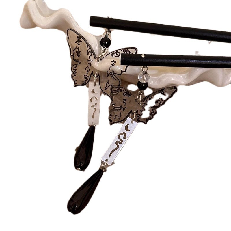 国风蝴蝶黑色木质流苏步摇发簪女夏天盘发发钗旗袍新中式古风发饰