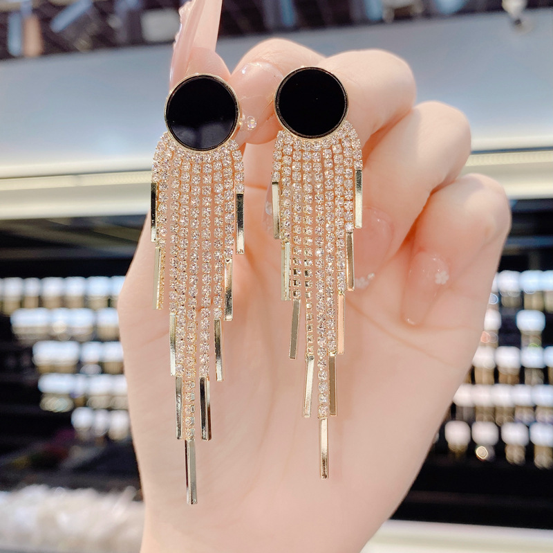 欧美个性夸张黑色圆环长款流苏耳坠女气质时尚名媛s925银针耳环女