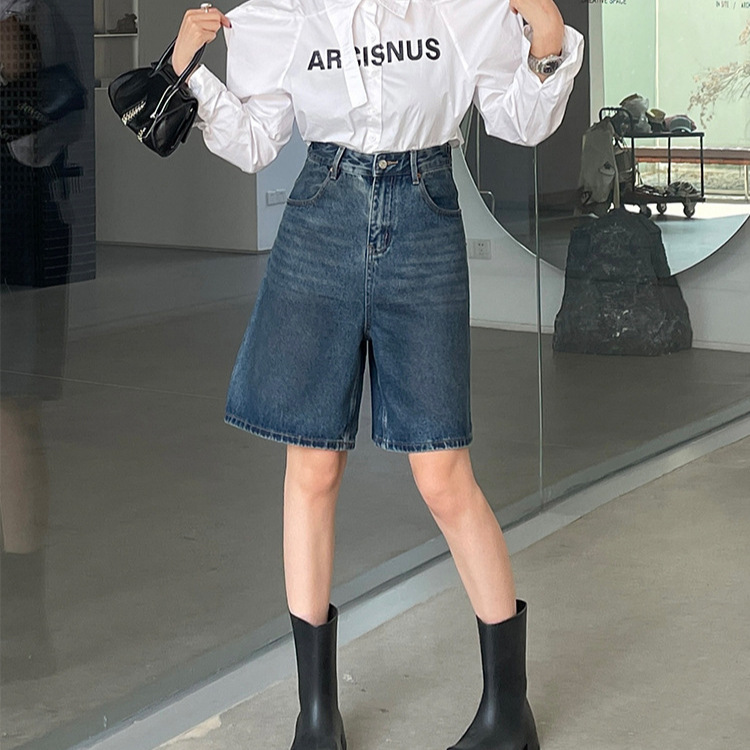 高端法式牛仔短裤女春新款复古深蓝色休闲高腰阔腿五分牛仔裤