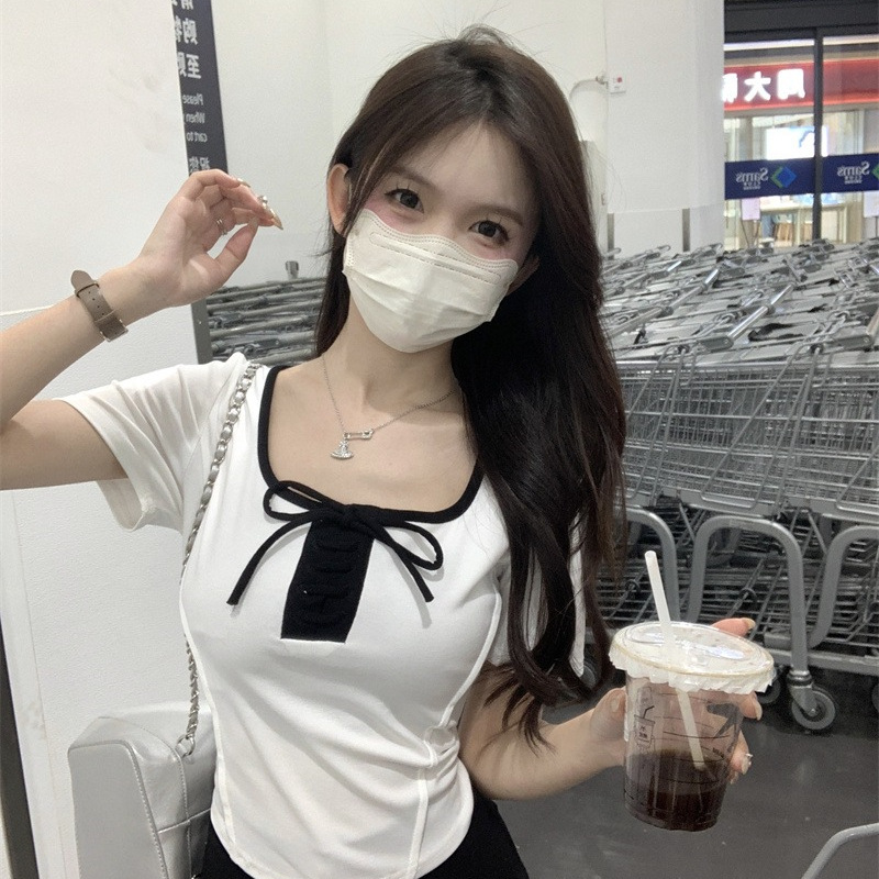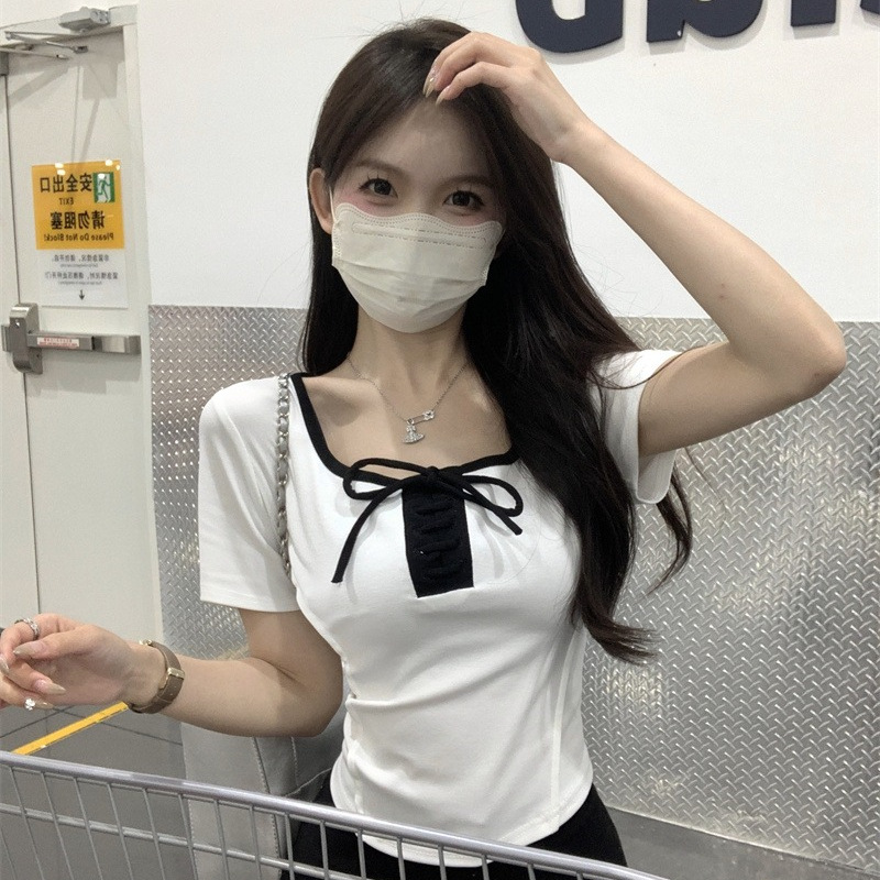 螺纹短款正肩上衣方领绑带T恤女装夏季韩版短
