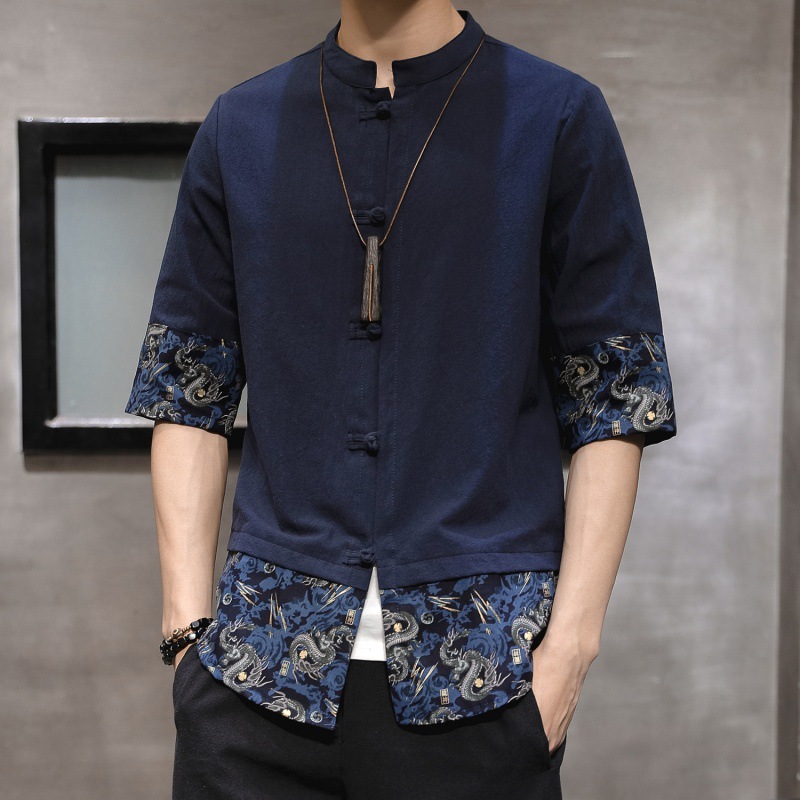 男士中国风棉麻纯色夏季盘扣短袖衬衫夏季立领拼色五分袖立领衬衣