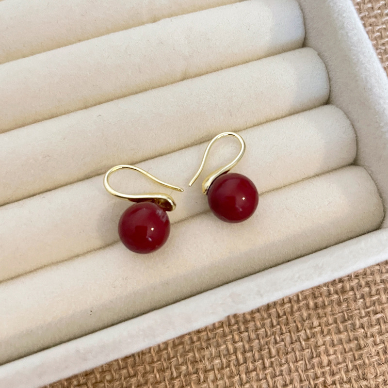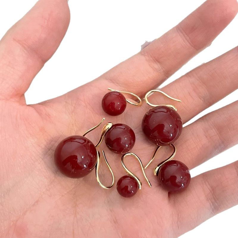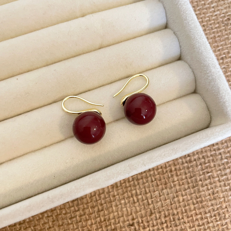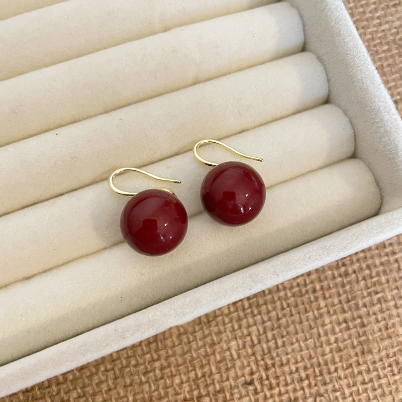 酒红色豆豆珍珠耳钩女复古港风独特耳环新款爆款通勤百搭耳饰