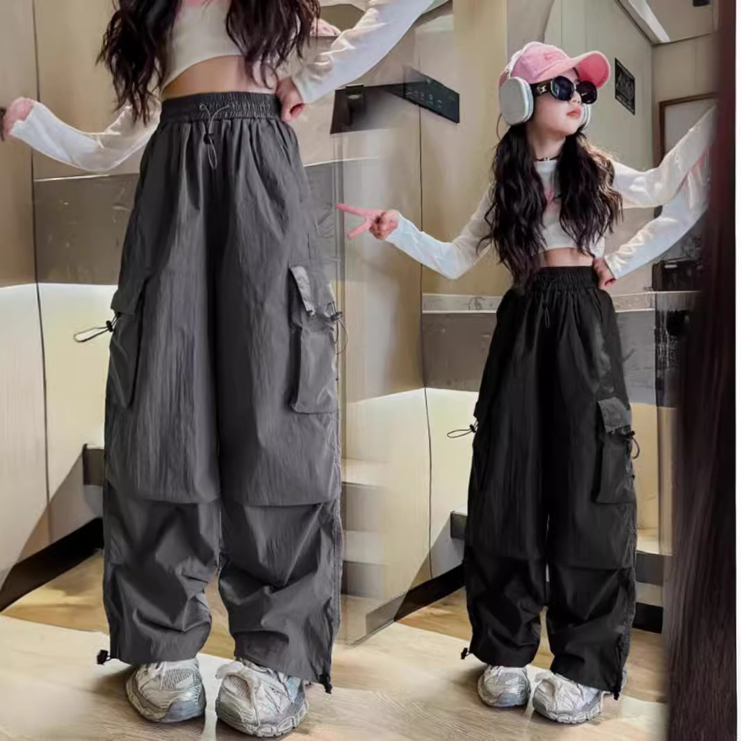 儿童工装裤子春夏新款女童美式炸街洋气阔腿裤运动束脚休闲裤