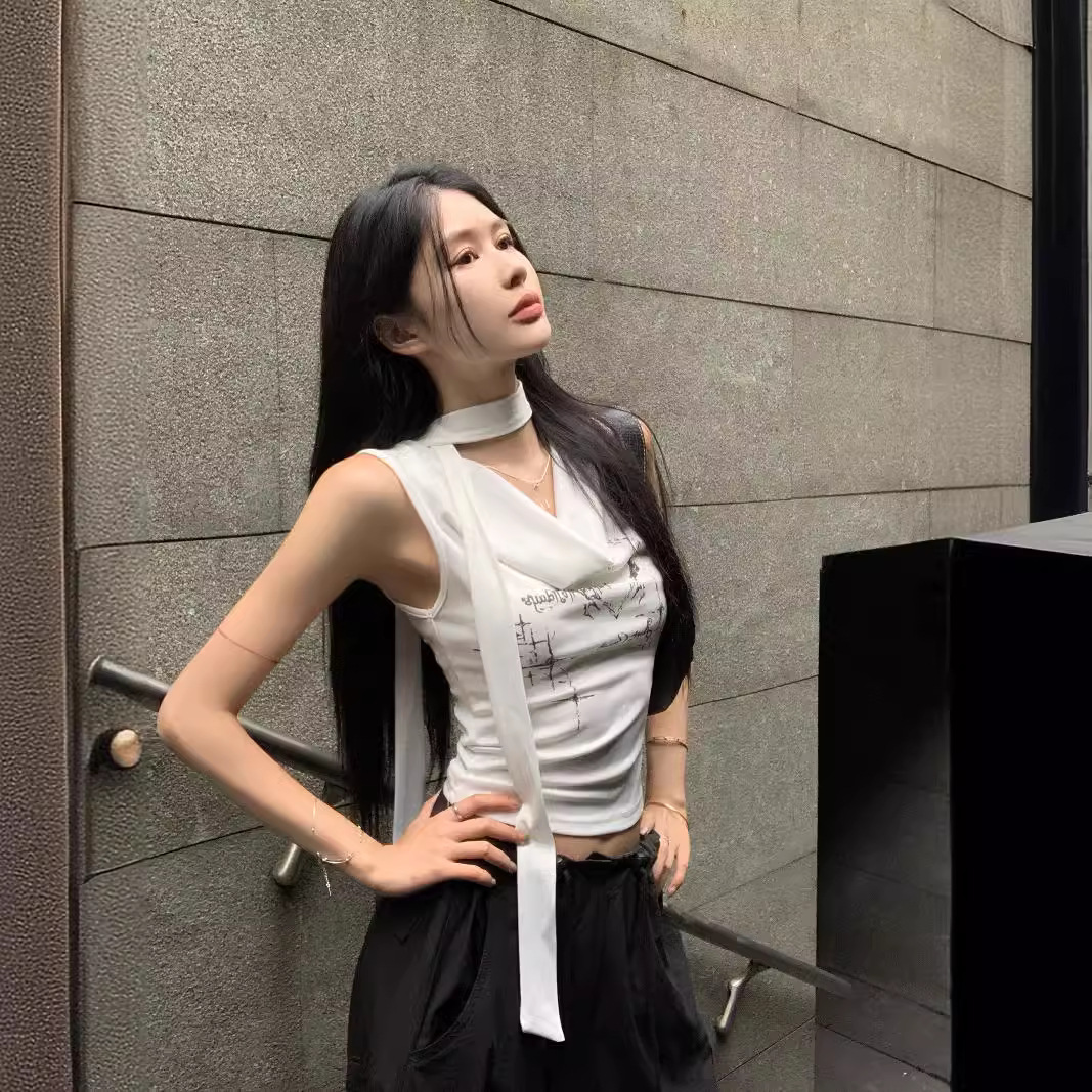字母印花灰色V领背心T恤女夏季修身显瘦辣妹设计感无袖短袖上衣