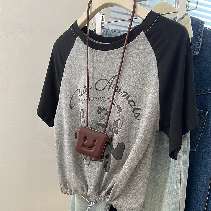 抽绳美式复古插肩袖t恤女短袖设计感小众小个子短款上衣