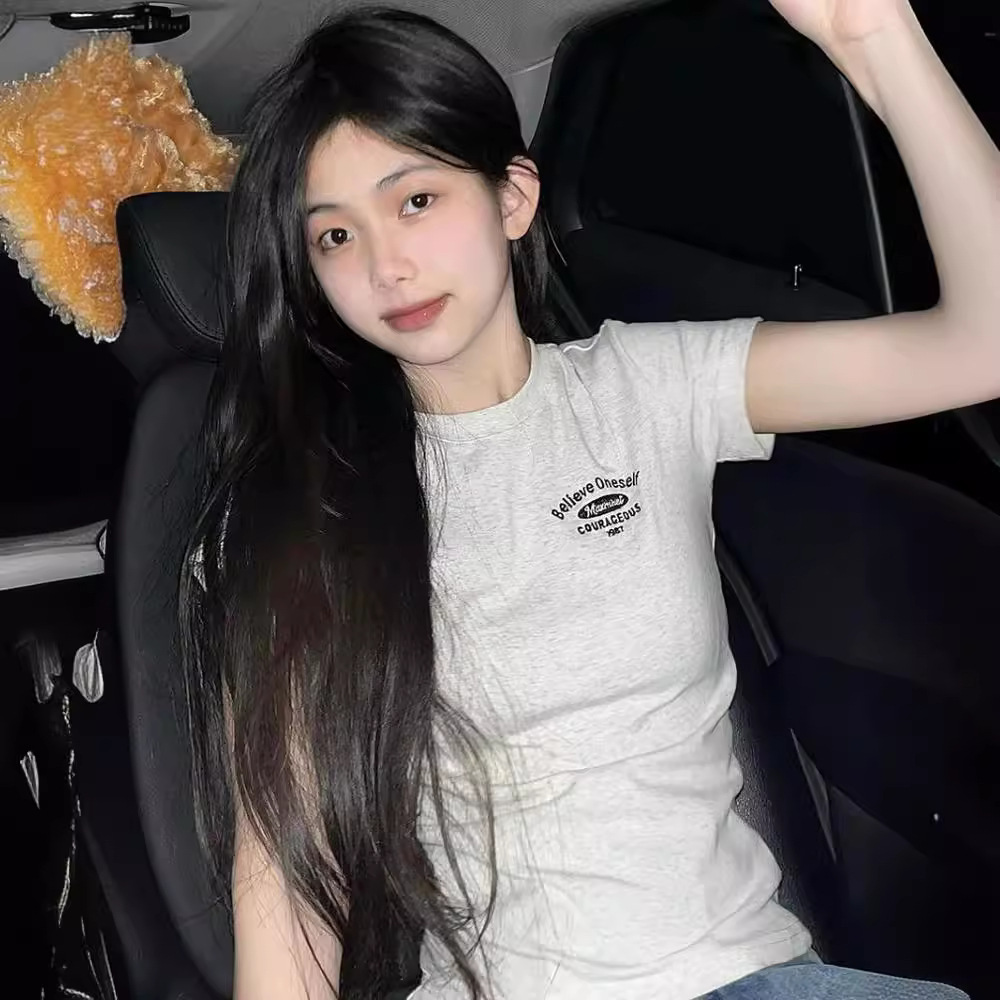 美式复古正肩刺绣字母短袖t恤女夏季设计感小众修身别致短款上衣