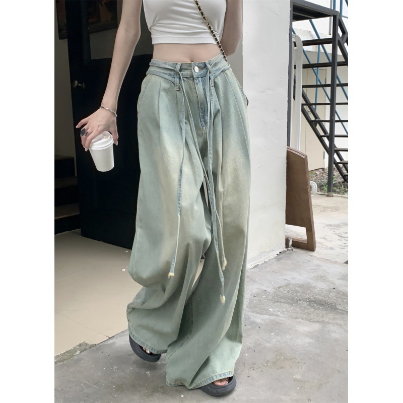 夏季新款复古辣妹慵懒宽松垂坠怀旧高腰宽松拖地牛仔长裤女