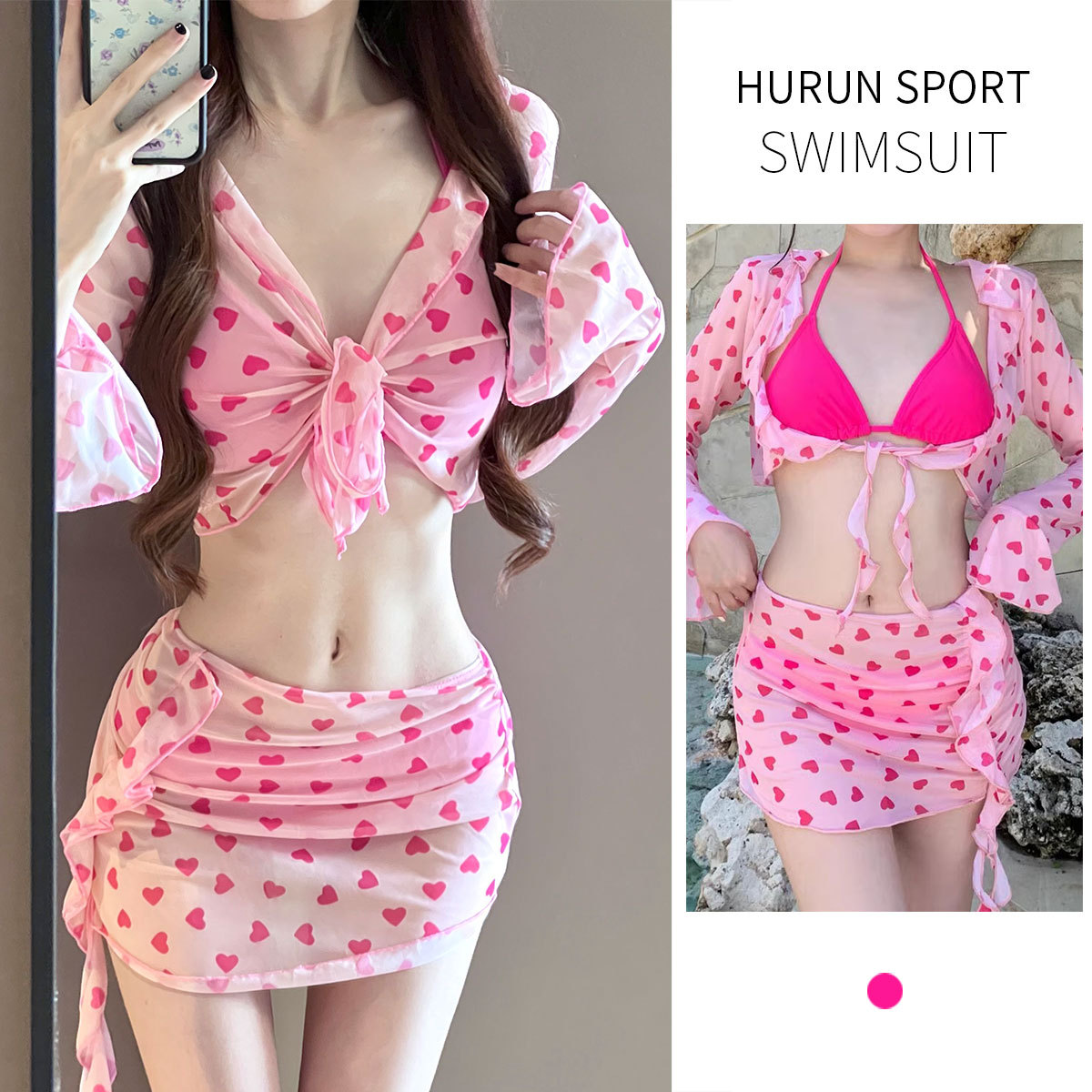 新款夏粉红少女四件套泳衣女分体绑带裙式温泉度假比基尼纯欲