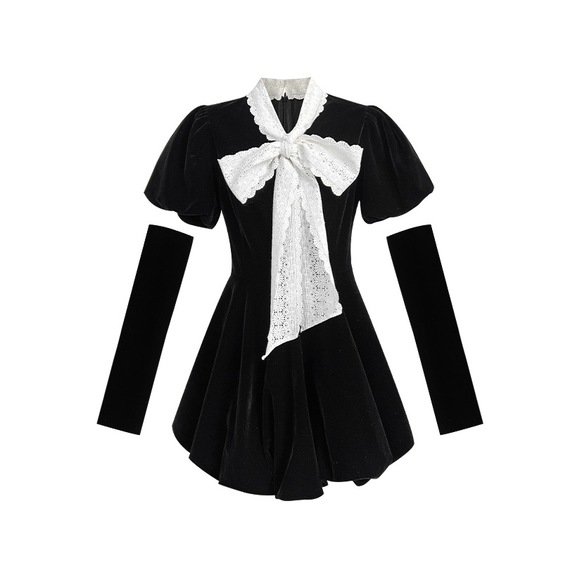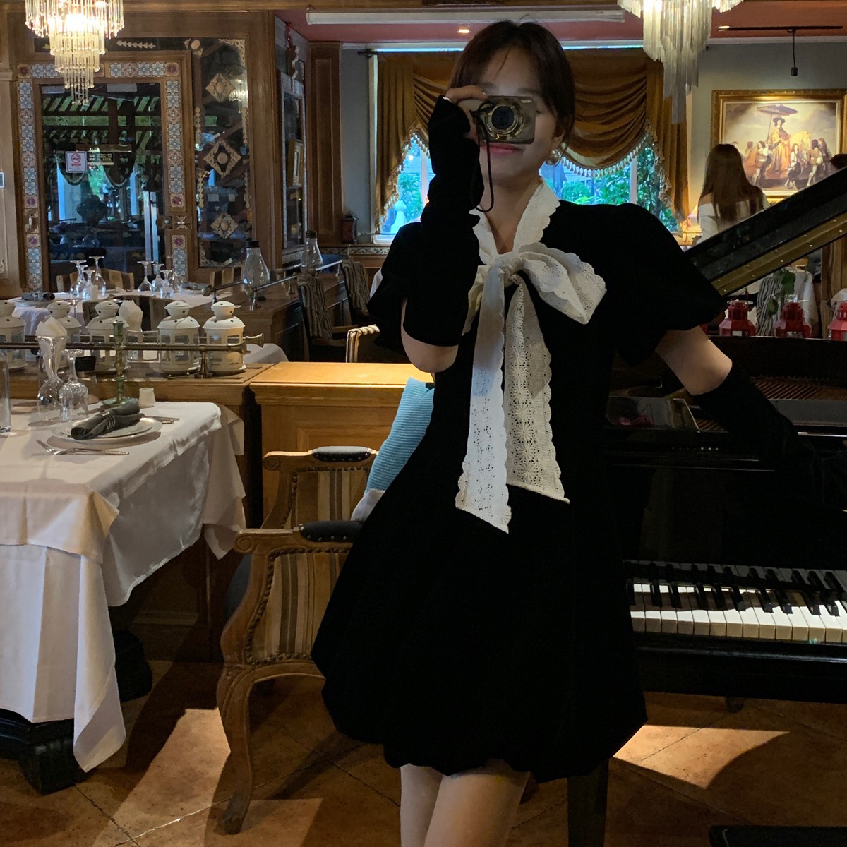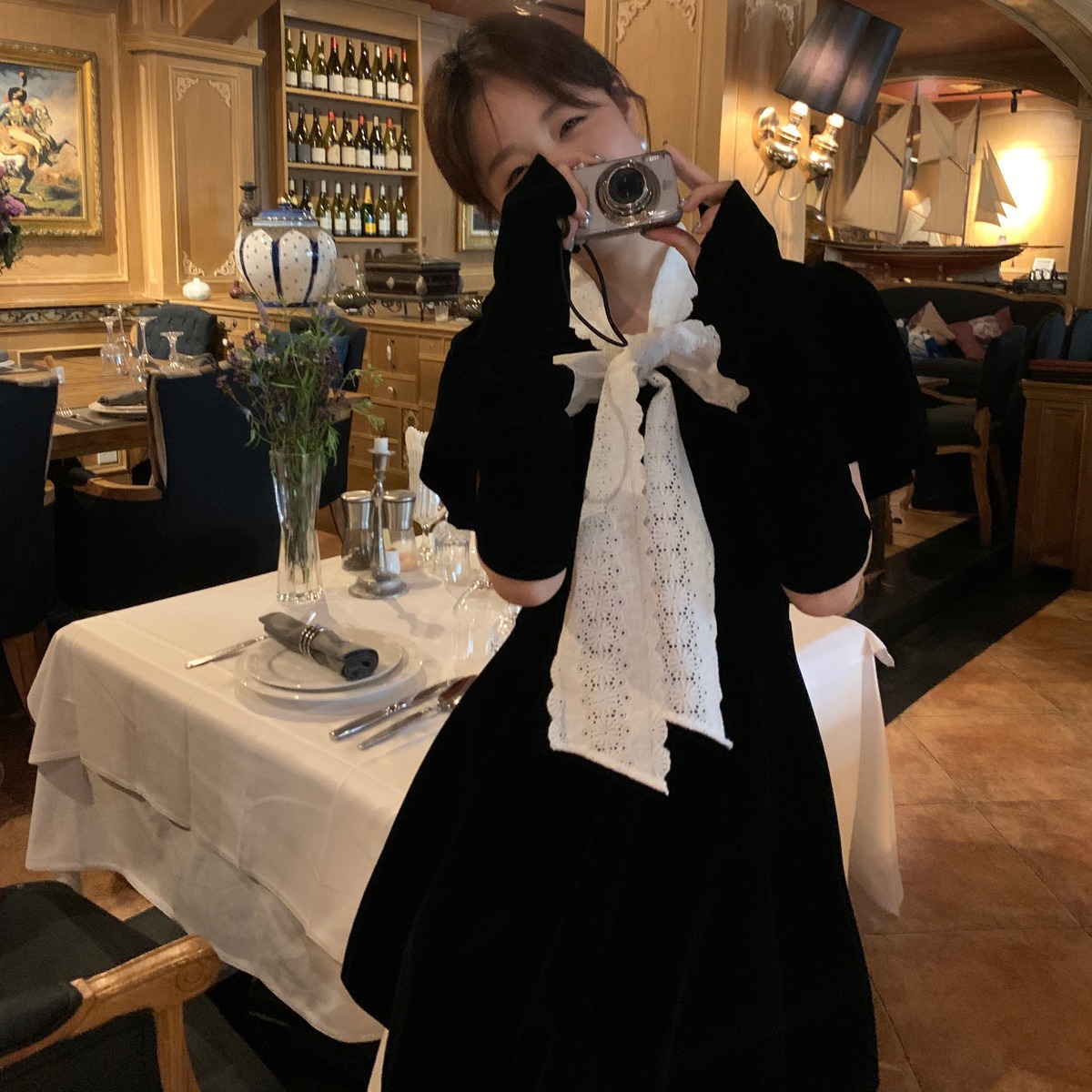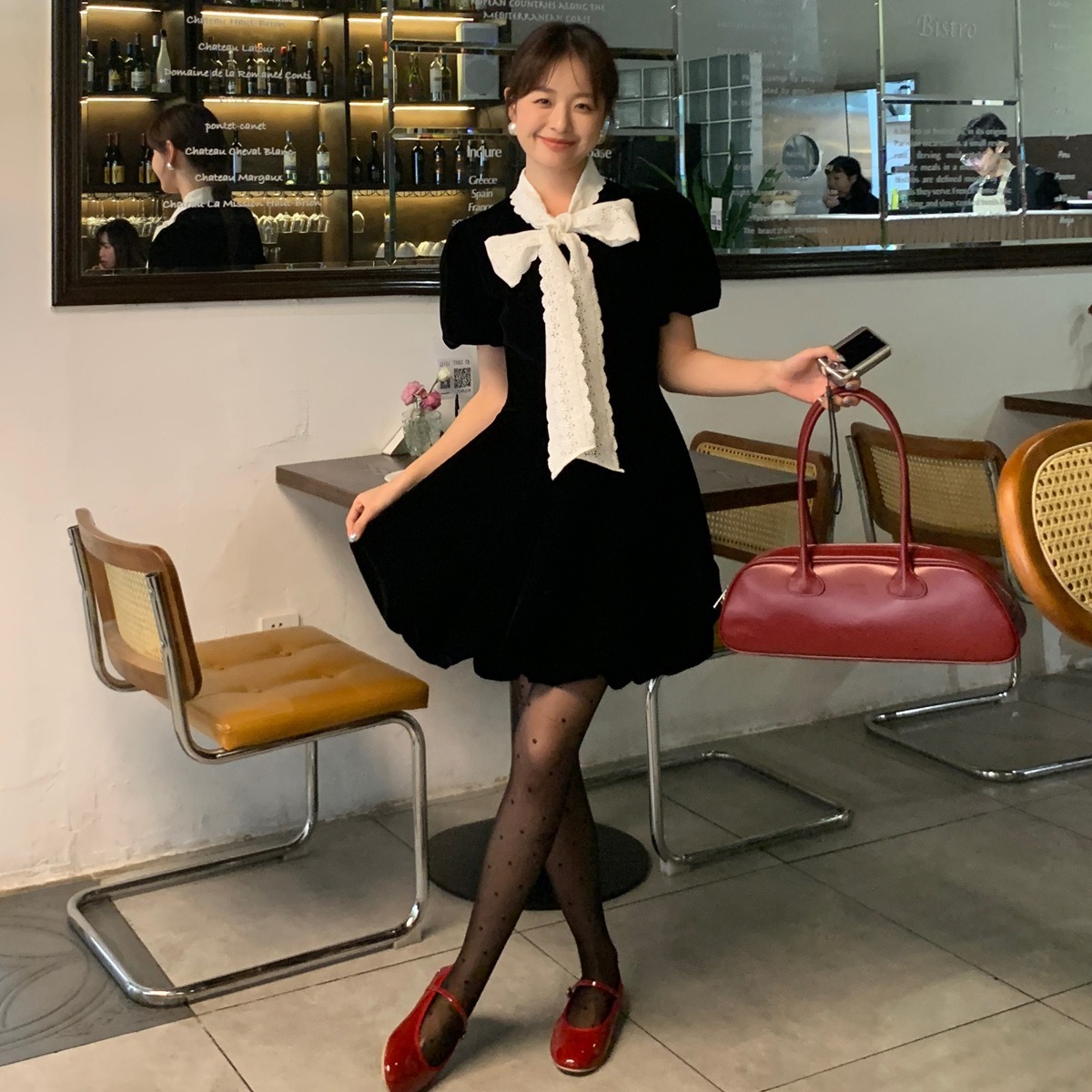 诠释美 NEWOPEN 宫廷风法式公主花苞小黑裙蝴蝶结丝绒连衣裙