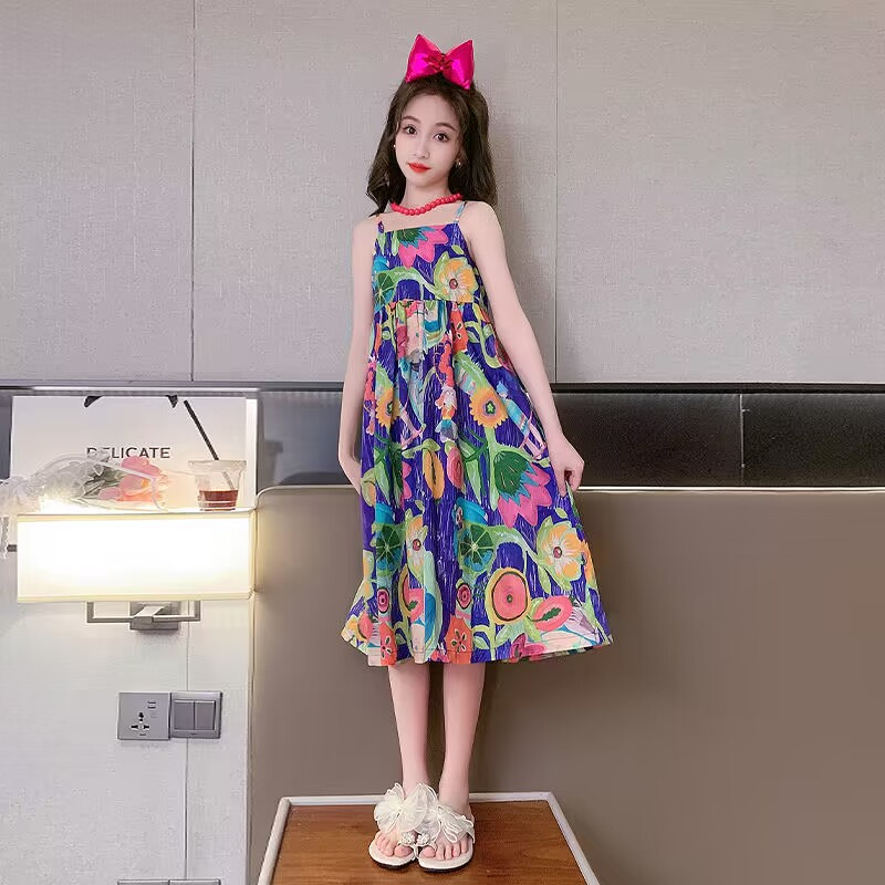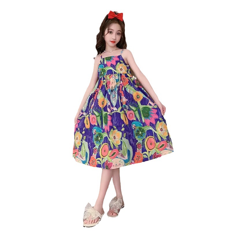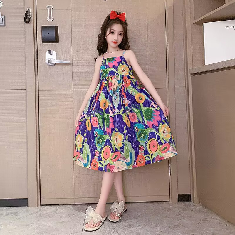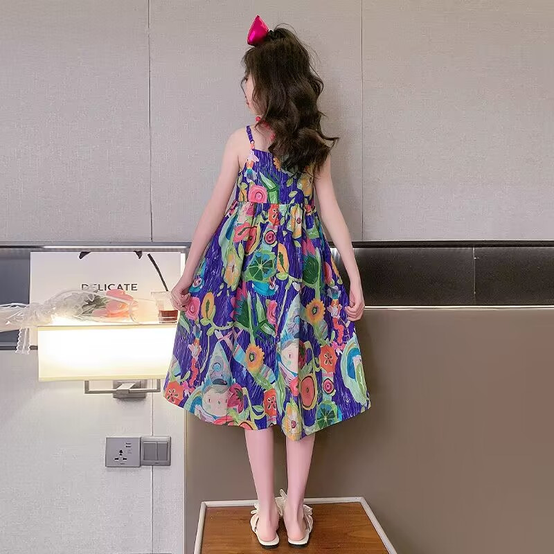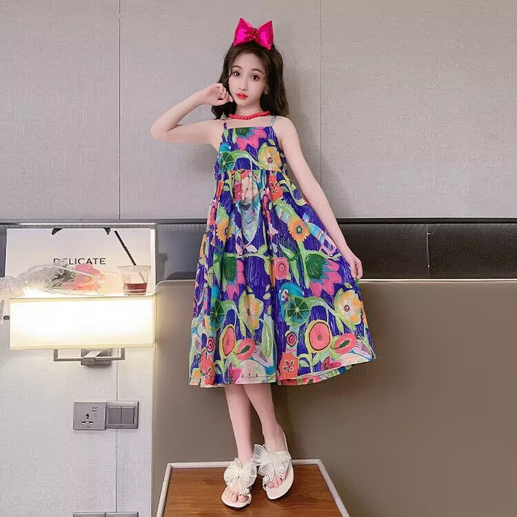 女童夏装薄款吊带裙新款中大童时髦油画连衣裙无袖宽松沙滩裙
