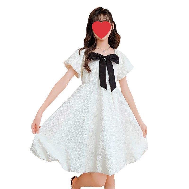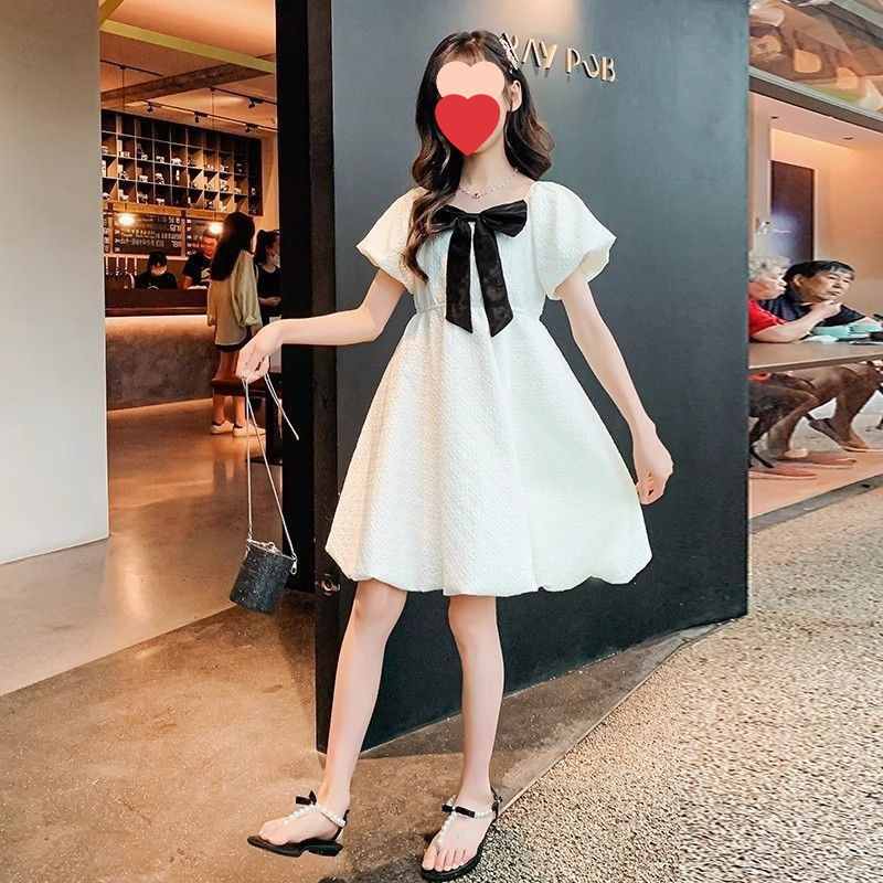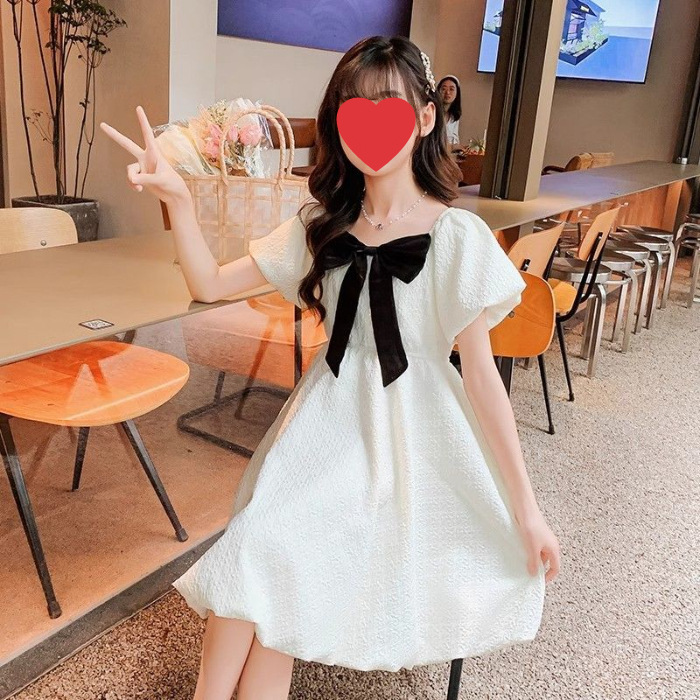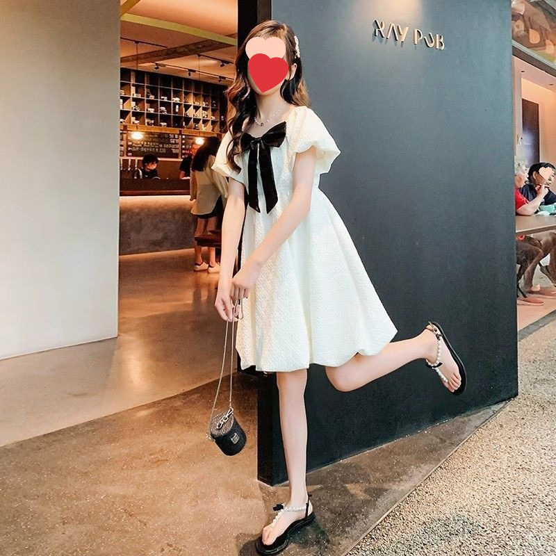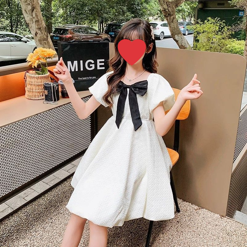 女童宝宝韩版洋气百搭休闲连衣裙儿童夏装时髦蝴蝶结泡泡袖公主裙