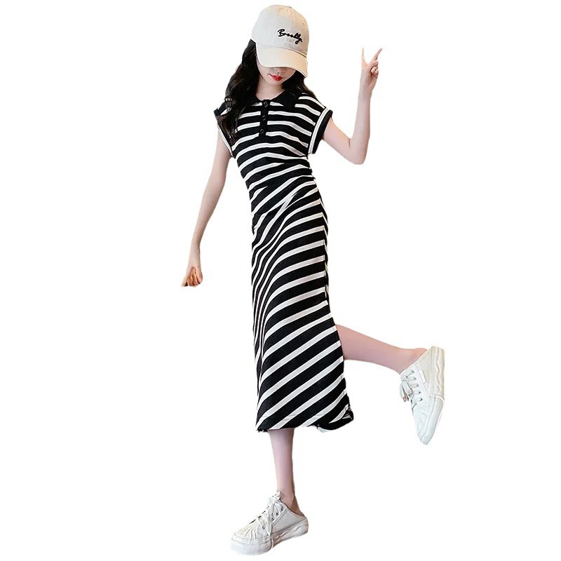 女童条纹连衣裙夏装新款洋气童装polo长款T恤裙大童儿童夏季裙子.
