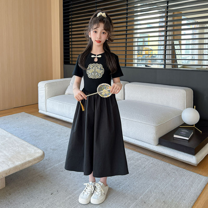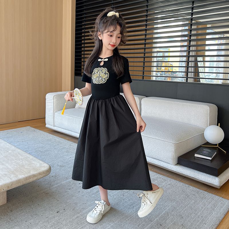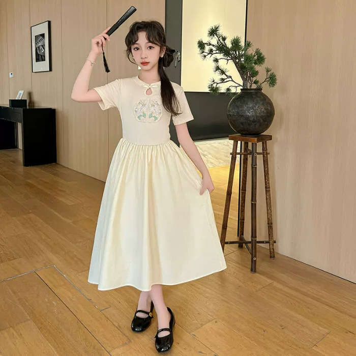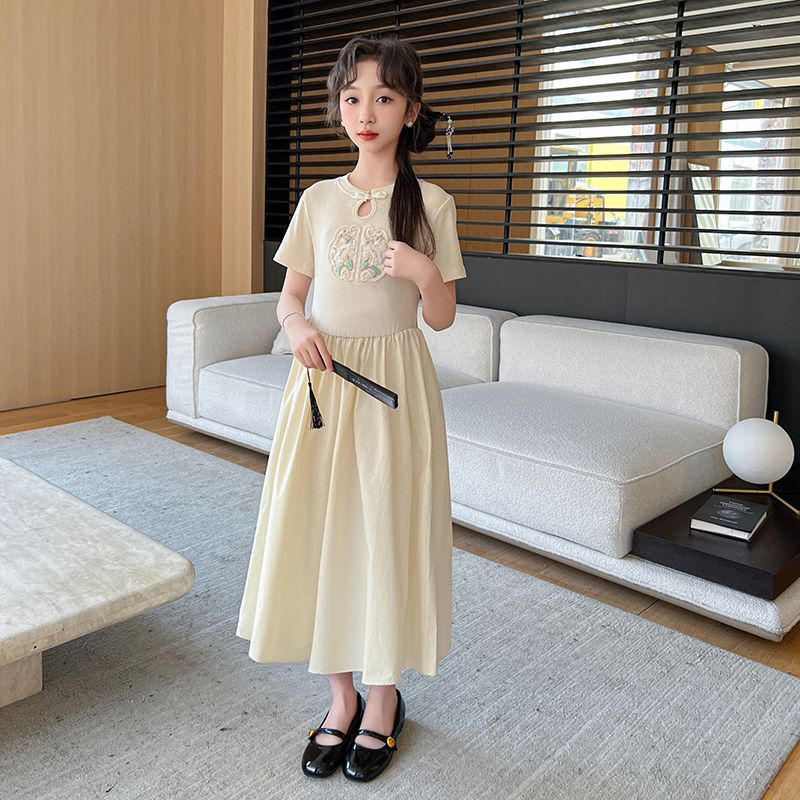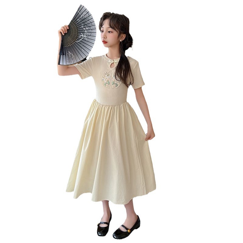 女童新中式国风短袖连衣裙中大童夏季新款洋气盘扣过膝时髦公主裙