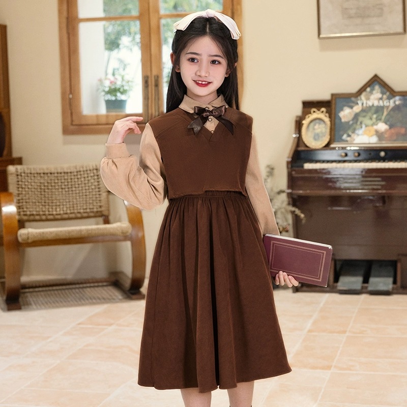 女童学院裙子春秋新款中大童加厚时尚公主裙红色女孩假两件连衣裙