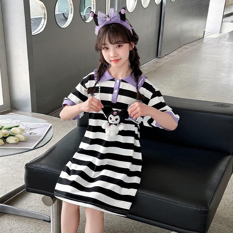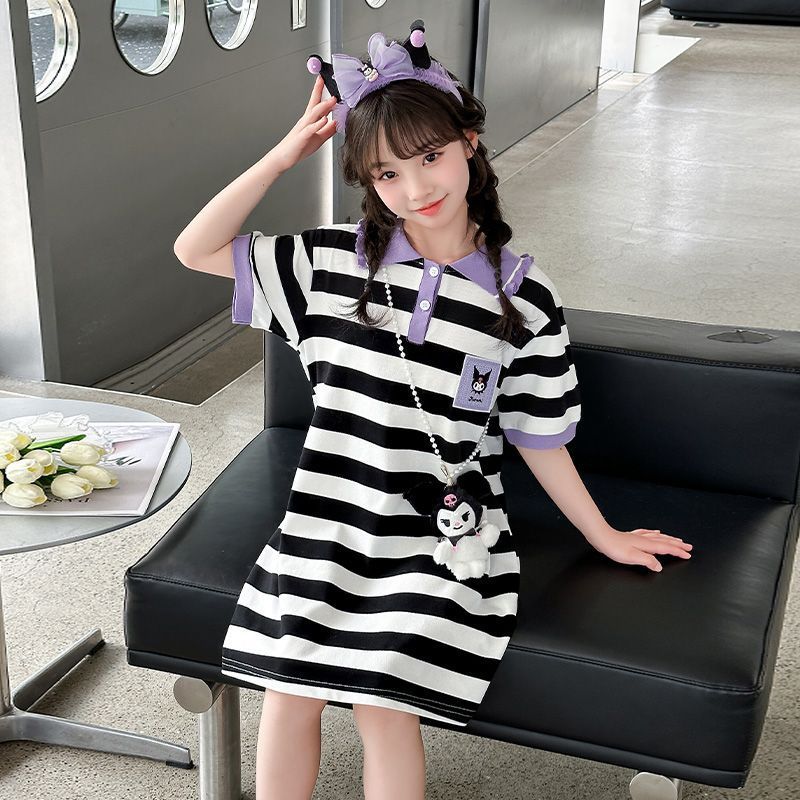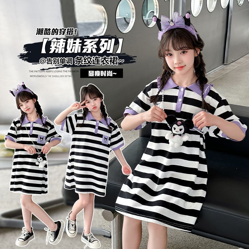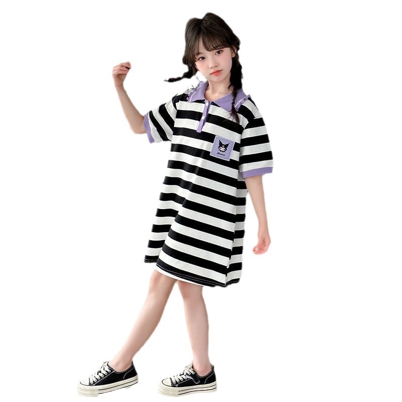 女童韩版休闲翻领连衣裙中大童夏季新款洋气时髦条纹短袖A字裙潮