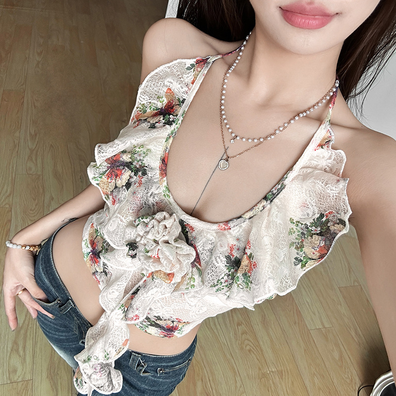 欧美风夏季新款女装系带挂脖小清新印花露脐木耳边小背心