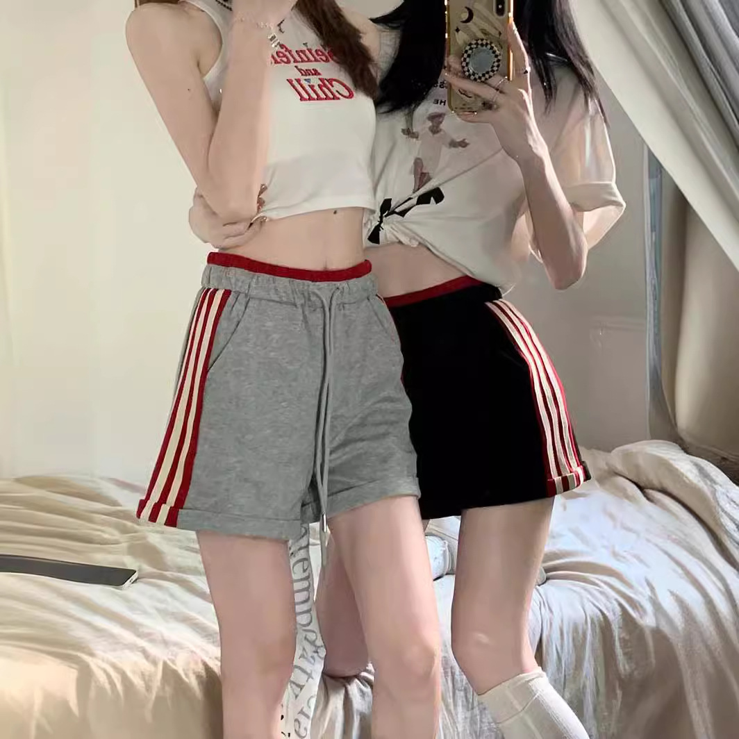 小个子条纹短裤女夏季撞色卷边休闲运动裤松紧腰三分阔腿中裤热裤