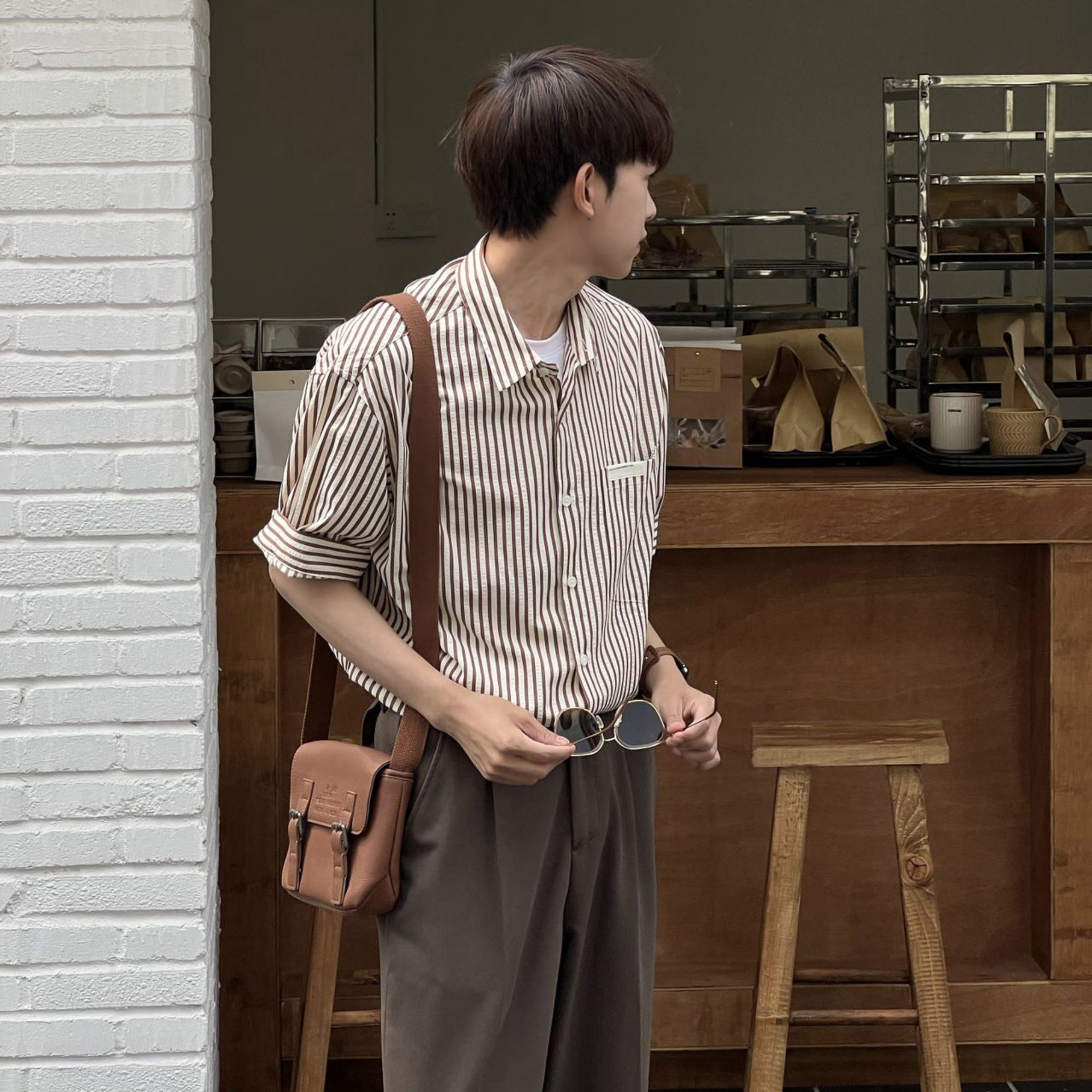 韩系条纹衬衫男士夏季新款时尚宽松潮流感百搭ins风休闲短袖衬衣