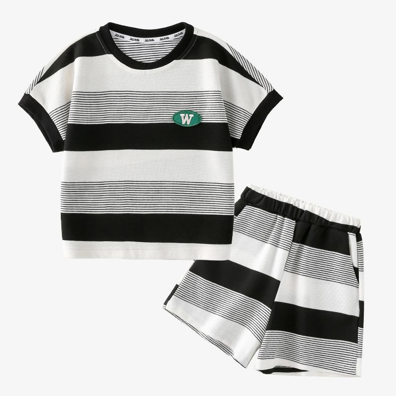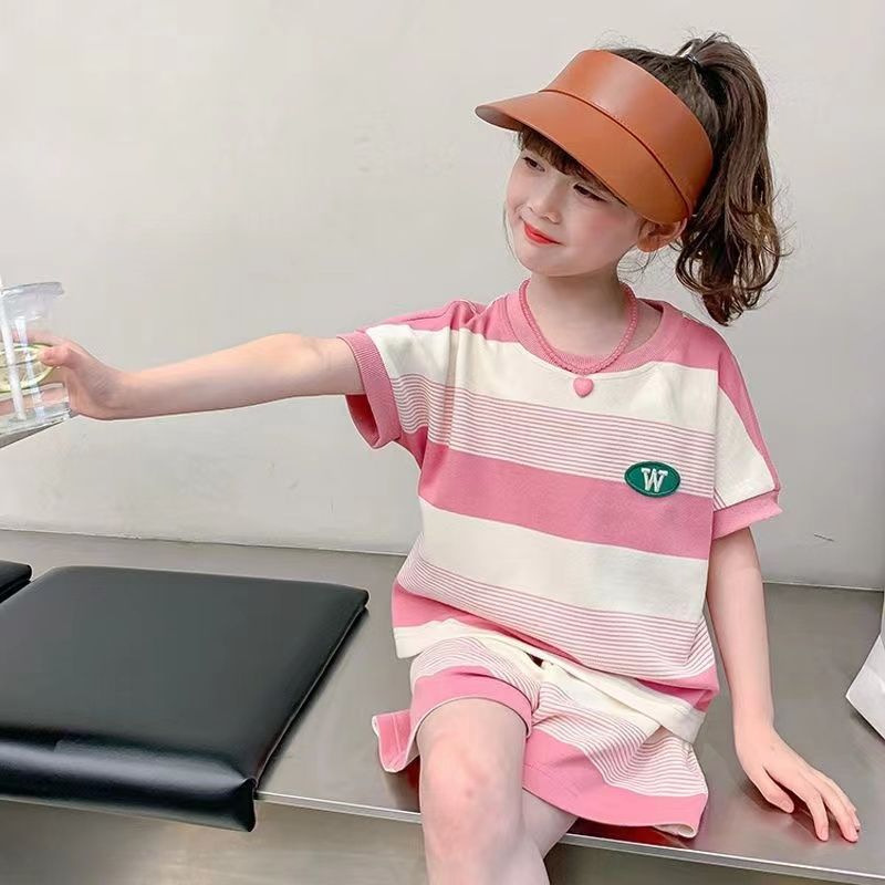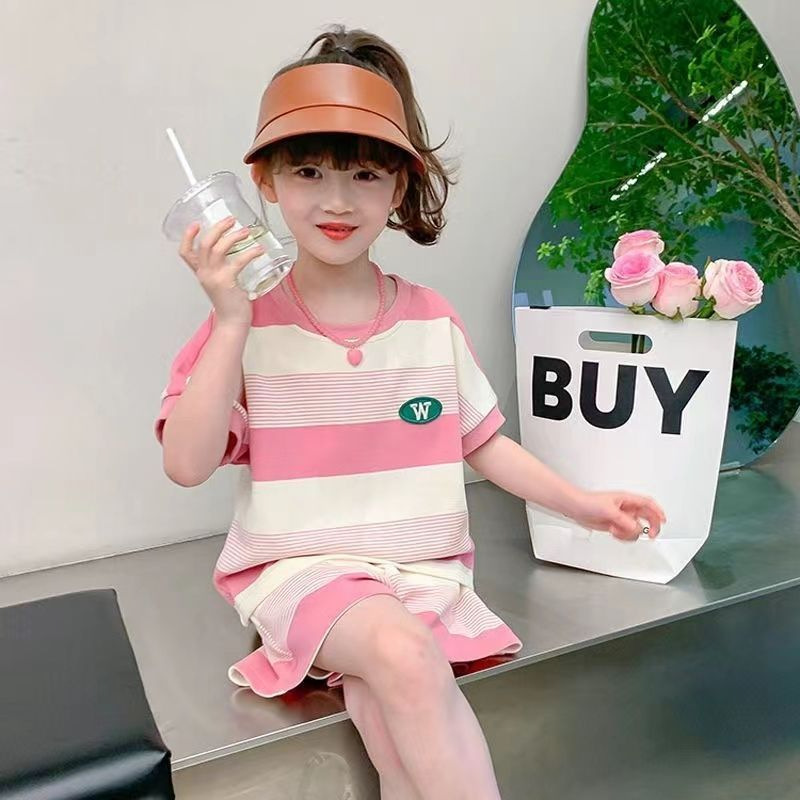 2025款热销现货夏季女童条纹套装新款洋气夏装运动短袖短裤两件套