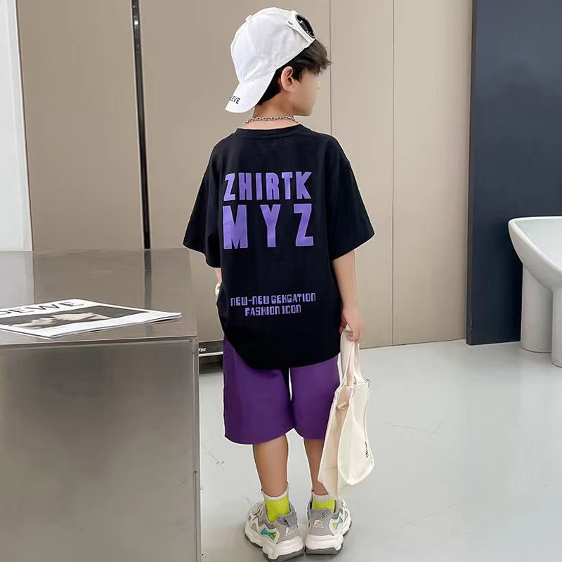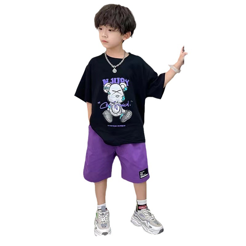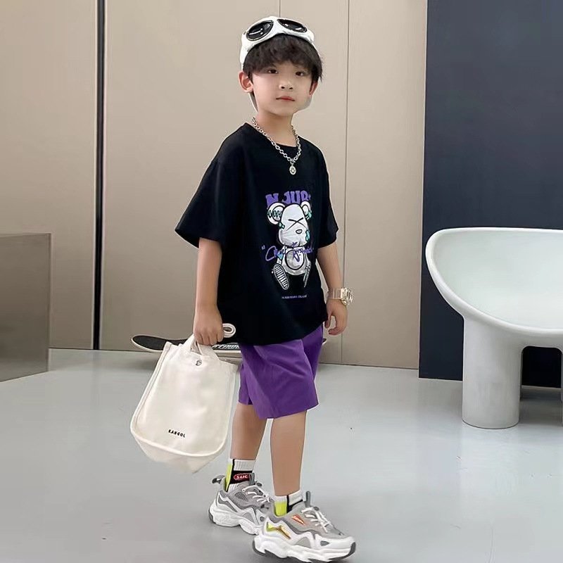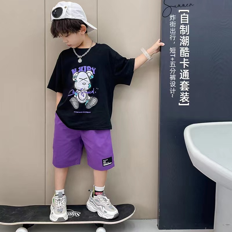 男童夏季薄款卡通T恤五分裤两件套2025新款大童美式街头嘻哈套装