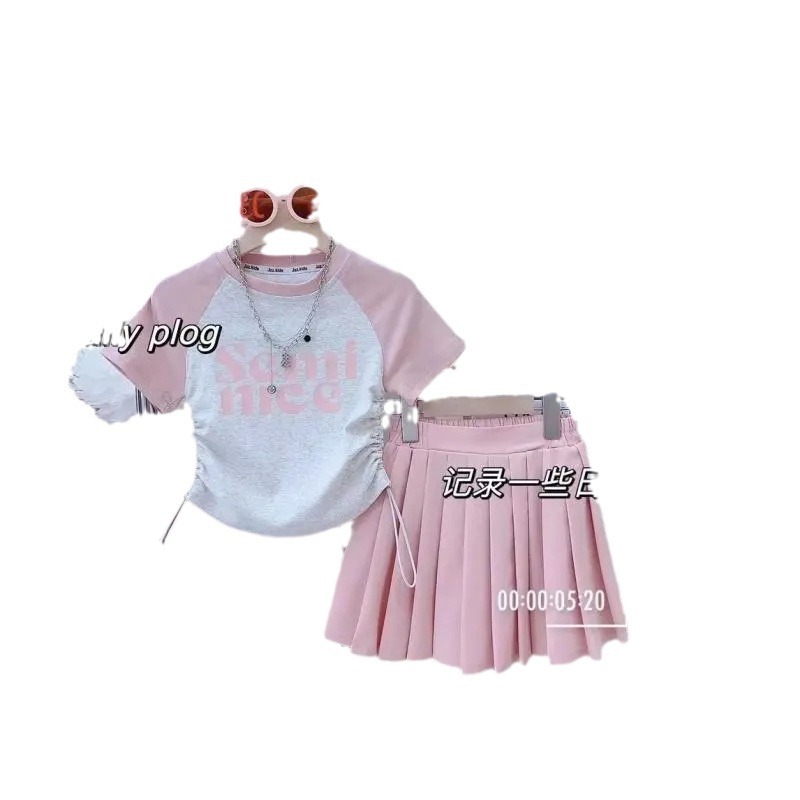 女童夏季套装2025新款韩版甜美短袖夏款儿童时尚休闲百褶裙两件套