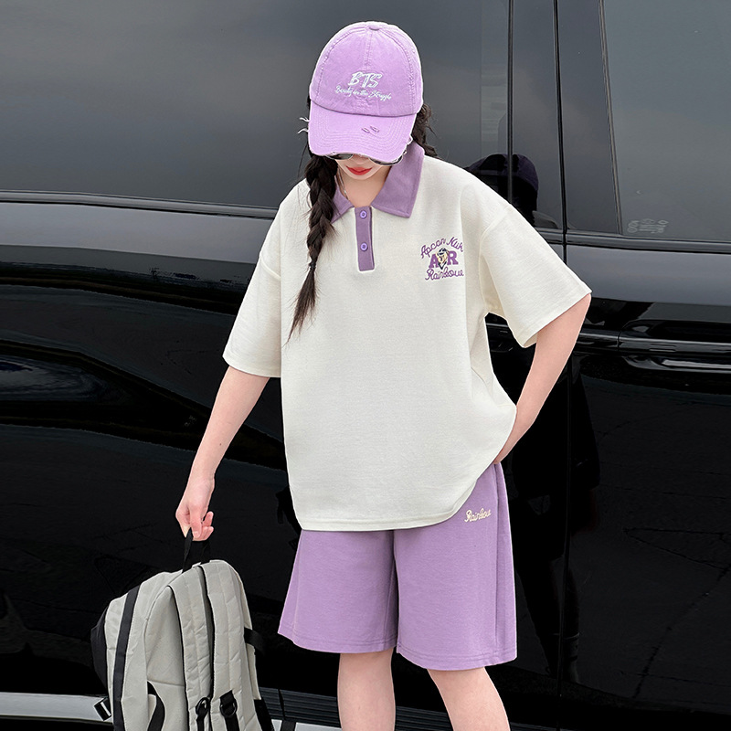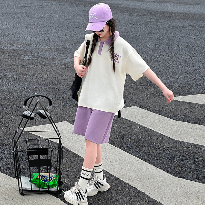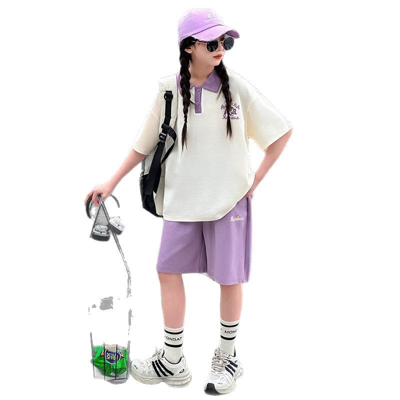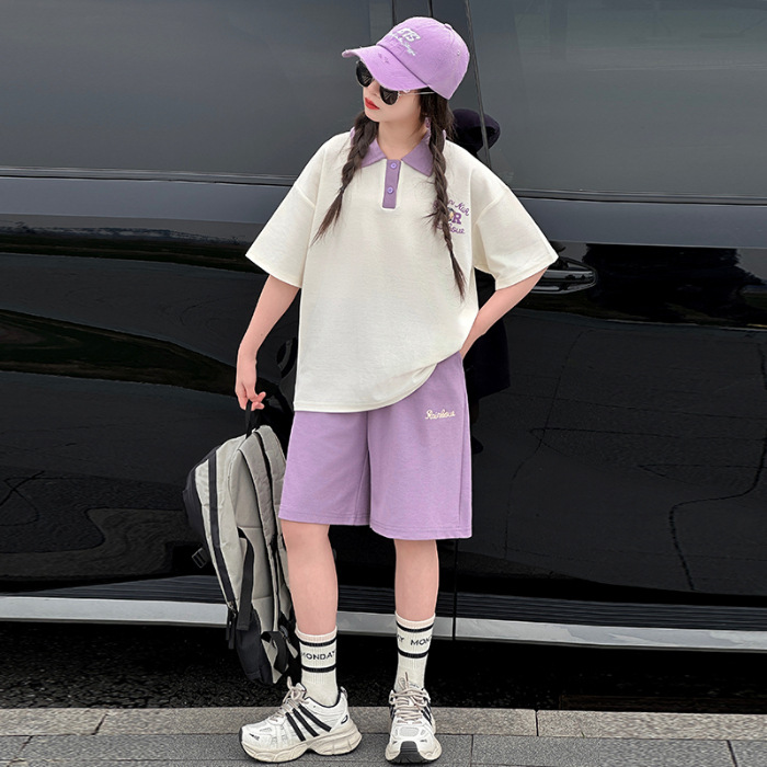 女童韩版时髦套装中大童夏季新款洋气字母翻领短袖时髦短裤两件套