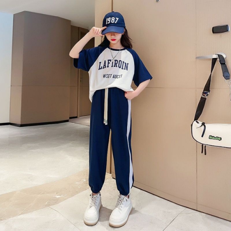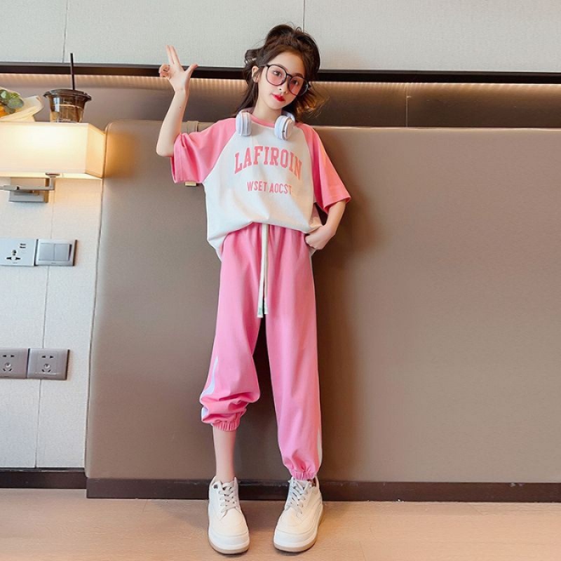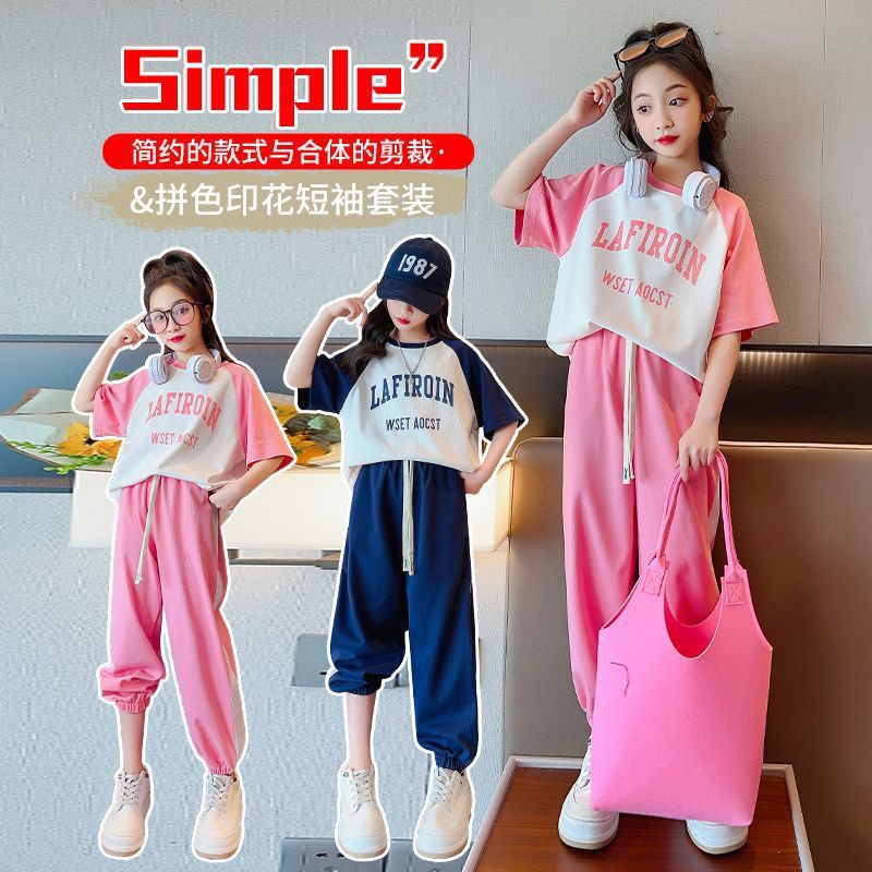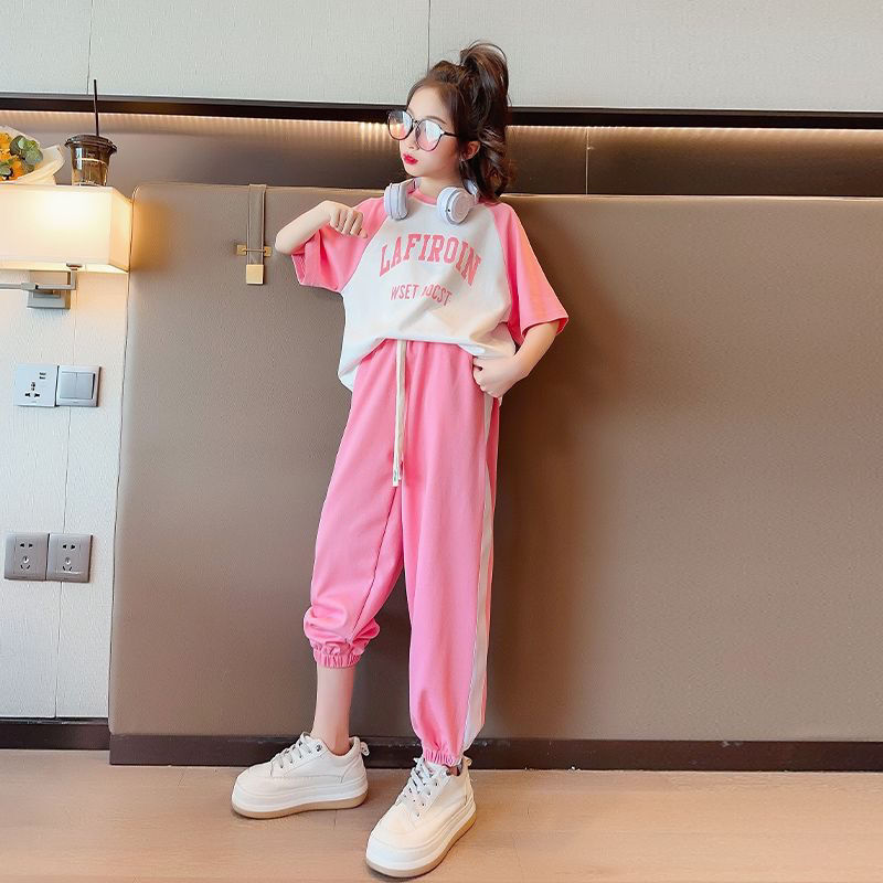 2025女童时尚套装夏装中大童短袖拼色上衣休闲裤学生运动服两件套