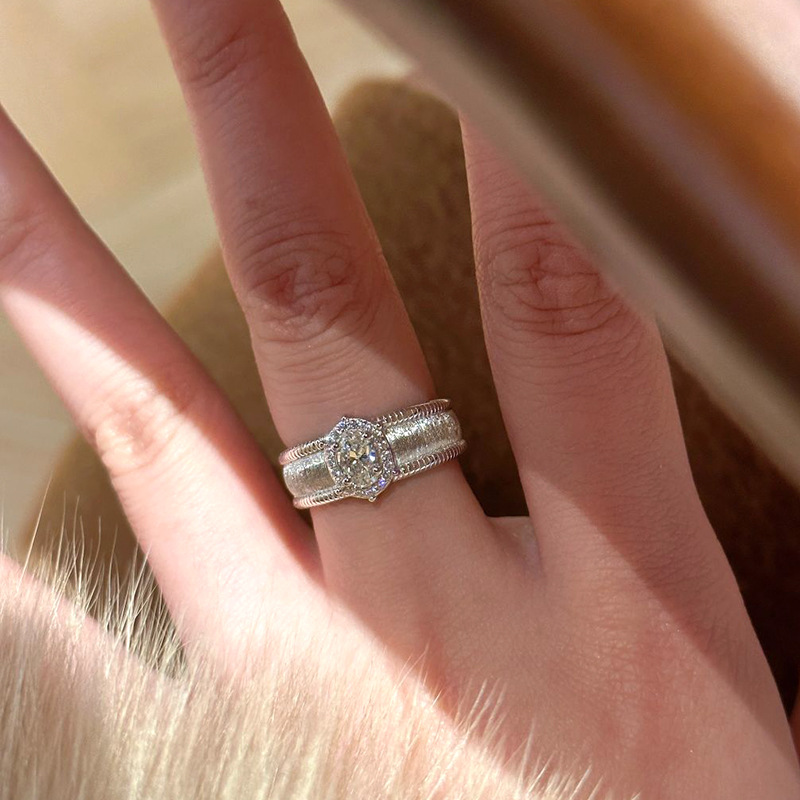 小红书爆款拉丝鸽子蛋戒指女中古vintage银色宽版闪钻宫廷风指环