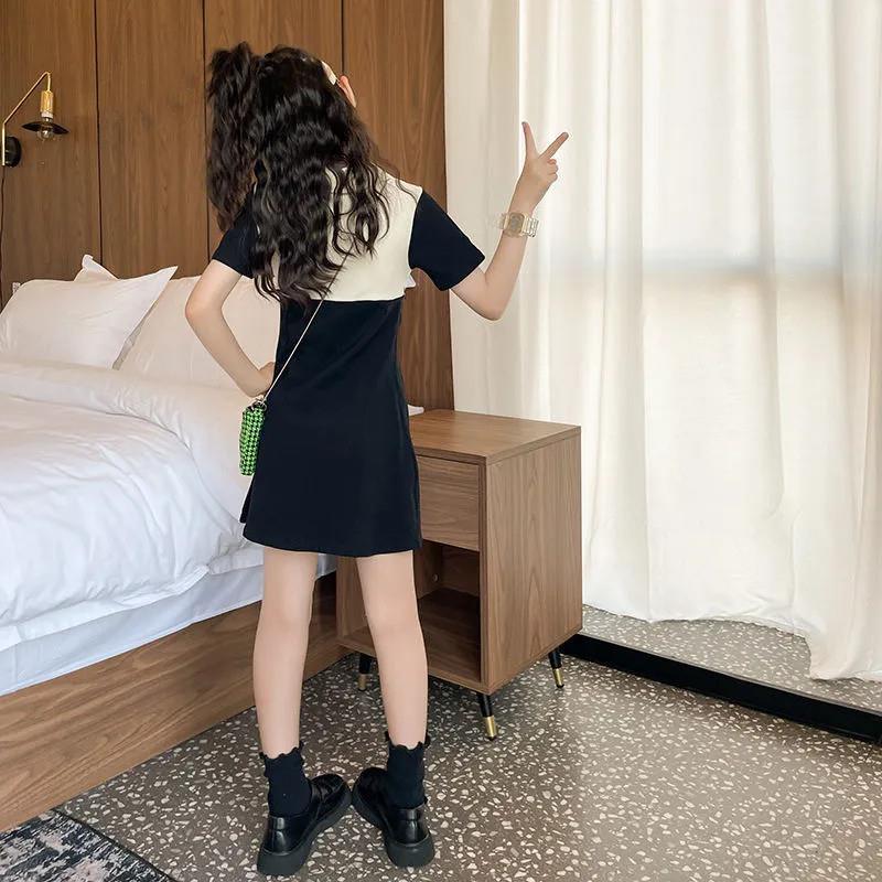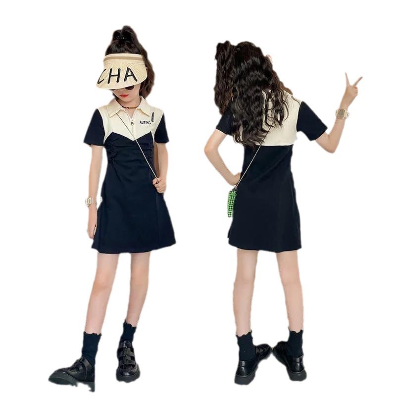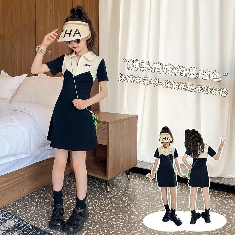 女童连衣裙夏季新款夏装中大童法式polo黑色短袖儿童公主裙子代发
